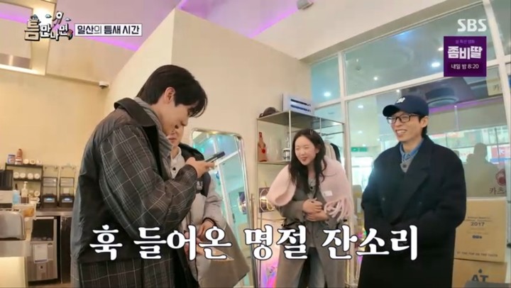 틈만나면,/사진=SBS캡처[스포츠투데이정예원기자]'틈만나면,'지예은의눈에유연석이들어왔다.17일방송된SBS예능'틈만나면,'설특집에는배우정상훈,지예은이출연했다.이날MC유재석,유연석과정상훈,지예은은버스를타고틈친구를만나러향했다.유연석과함께서서가던지예은은"저다음에내려요""'슬기로운의사생활'(이하'슬의생')너무잘봤다"며플러팅을시작했다.그러나유연석이"제역할이름이뭐였는지아시냐"고묻자,"기억이안난다"고회피하는모습으로웃음을자아냈다.이날의'틈친구'는소방공무원동료들이었다.운좋게같은직무로발령받아일한네사람은추억을쌓고자사연을접수했다고.1단계틈미션은컵안에든탁구공을지키면서단체줄넘기5회를하는것이었다.줄넘기를무서워하는지예은은들어갈타이밍을잡지못해실패를겪었다.그러나두번째시도만에성공했고,소방관들은"고"를외쳤다.2단계틈미션은릴레이탁구공전달이었다.난이도가높은탓에세번째,네번째도전이모두실패로끝났다.하지만다함께구호"점프"를외치며호흡한덕에미션을성공했다.소방관들은"아름다운추억으로끝내겠다""너무힘들다"며"스톱"을결정,첫틈미션이성공으로마무리됐다.[스포츠투데이정예원기자[email protected]]Copyright©스포츠투데이.무단전재및재배포금지.
