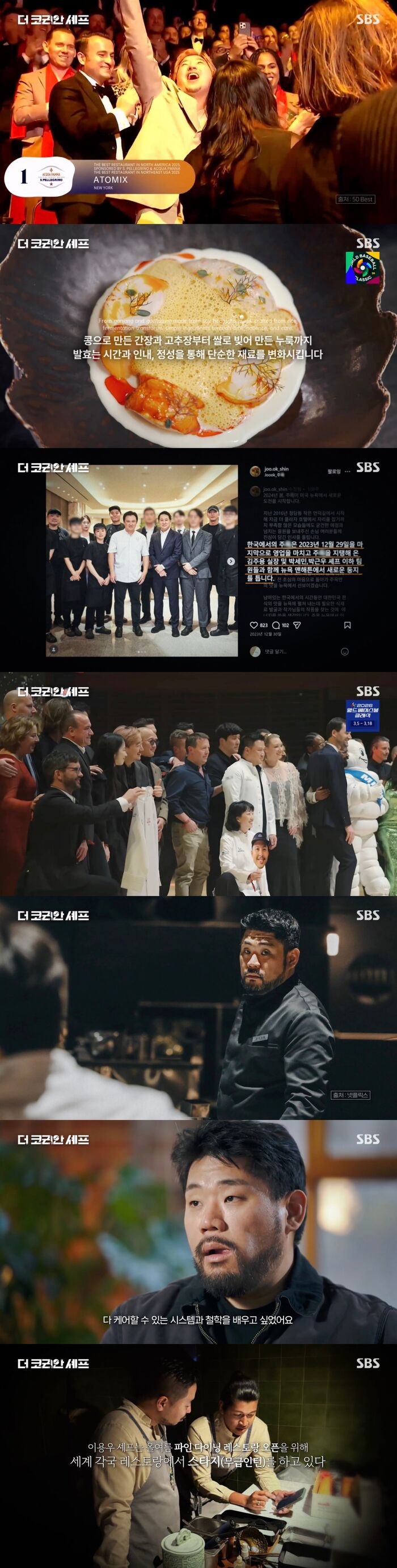 [SBS연예뉴스|김효정에디터]한식에인생을건'코리안셰프'19일방송된SBS'더코리안셰프'2부에서는'경계를넘다'라는부제로세계파인다이닝의최대격전지,뉴욕에서자신의길을가고있는셰프들을조명했다.미국뉴욕맨해튼에위치한파인다이닝아토믹스.이곳은한국인셰프가이끄는한식파인다이닝레스토랑으로전세계모든미식가들이가보고싶어하고다녀온사람들은만족스러워하는곳이다.1인당400달러,한화로60만원인한식코스경험을위해전세계인들이모이는이곳은박정현박정은부부가이끌고있다.오픈첫해부터미슐랭1스타,다음해2스타를받은이곳은지난해9월북미최고의레스토랑1위에선정되는놀라운성과를가져왔다.미슐랭가이드와함께전세계셰프들이선정되고싶어하는50베스트레스토랑랭킹.그중북미레스토랑랭킹에쟁쟁한레스토랑을뚫고한국레스토랑이1위에오른것.그리고전세계레스토랑을기준으로한이랭킹에서는6위에올라놀라움을자아냈다.한식의전통을단순하게전달하는게아니라셰프의경험을토대로자신만의언어로표현하고자한아토믹스.특히이레스토랑의요리에는한국의발효미학이담겨한식의새로운영역을열었다.레스토랑의시그니처요리중하나인랍스터요리의기본소스는누룩과고추장을이용한것으로외국인들이먹었을때도어렵지않은맛이지만한국적인맛과표현이들어있었다.그리고이곳의모든요리에는메뉴카드가나가는데셰프가설명하고싶은메뉴의스토리가담겨있어그것들을읽으며요리를먹다보면요리에대한이해도가올라가고고객들에게이는자신의자산으로이어질수있었다.또한한국식재료들을영어로번역하지않고한국어발음을그대로표현한아토믹스는뉴욕의한가운데서가장한국적인문화를경험하는것.그것이레스토랑을통해전하고자하는이들의메시지였다.한식을넘어한식문화를처음이야기하며경계를넘어선아토믹스.이들은음식을넘어문화를알리겠다는생각으로레스토랑을오픈했다.같은대학호텔조리학과선후배인부부는결혼이틀만에뉴욕으로향했다.음식에대한관심도나시장의크기로보아뉴욕에서시작하는것이좋지않을까생각해서도전것.뉴욕의한식파인다이닝에서경험을하고4년만에자신들의레스토랑을오픈하고2018년지금의파인다이닝레스토랑아토믹스에서셰프와매니저로레스토랑완성시켰다.박정현이라는아티스트가만든작품을박정은이라는도슨트가손님들이100%200%받아들일수있도록하는것.그리고두사람은도전13년만에북미최고의레스토랑에선정되었다.뉴욕에서,미국전체에서가장선두에서있는레스토랑이된것.맨해튼의코리아타운,뉴요커들의주목을받는레스토랑이하나더있었다.빌딩의가장높은층에위치한이곳은문을열고들어가면펼쳐지는한국적인공간이눈길을사로잡았다.전통에가까운한식을새롭게해석해선보이고있는한식파인다이닝주옥은오픈한지3개월만에미슐랭1스타,다음해2스타를받았고그선두에오너셰프신창호셰프가있었다.그는공간에서부터직원유니폼까지이어지는전통의분위기로더한국적인요소로자신만의길을택했다.사실그는한국에서이미정점에오른셰프였다.서울5성급호텔레스토랑에서미슐랭2스타까지받았던신창호셰프.그런데그가2024년,모든걸정리하고뉴욕으로향한것.누군가에게는평생의목표인미슐랭2스타를받았음에도낯선땅에서새로운도전을선택한이유에대해그는"한국에서안주하고편하게살기에는당시너무어리다고생각했다.당시내나이가45살인데너무많은인생이남았고요리를제대로해보지도않고끝내는느낌이었다"라며안정을누리고싶은나이를도전의적기로여겼다고밝혔다.또한자신의미래는있지만팀의미래는없다며팀에대한사명감을갖고있던그는도전을선택했고그를믿고따른팀원들이함께했다.셰프의확신은팀원들의용기가되고불안을더큰다음이있을거라는믿음으로견뎌냈다.한국의성공적인레스토랑의문을닫고뉴욕으로온셰프는"이곳에누군가가저를믿고새롭게시작하려고하는데제가제대로못해내면큰실례라고생각했다.그래서온전히이곳에올인해봐야겠다는생각이었다"라며이유를설명했다.주6일,이른아침에출근하는신창호셰프.그는전날자정이다되어퇴근하고8시간만에다시주방으로향해출근하자마자육수작업을했다.보통미슐랭2스타급레스토랑의기본적인작업은직원들이맡았지만그는자신이직접하고있었던것.퀄리티컨트롤에대한집요한생각을갖고있던그는본인이생각한방향에대해서는타협이없었고이를몸소선보이며자신을따르는이들이그것을느낄수있도록만들었다.요리는유일한즐거움이었던신창호셰프는돈이없어서요리학교를졸업하지못하고많은레스토랑을거쳐일을하며35살까지한국에만머물렀다.그러나시간이갈수록해외생활에대한갈증이생겼고이에이미해외유명레스토랑총괄셰프거친강민구셰프에게도움을청했다.이에강민구셰프는그에게새로운무대를열어주었다.영어공부부터현지생활등조언을아끼지않으며마이애미의한레스토랑에갈수있도록도와준것.35살이면요리사로는많은나이였지만신창호셰프는미국에다녀온후그런생각이사라졌다.그리고해외의경험을바탕으로한국전통조리법에자신만의해석을더해새로운한식을만들어갔다.뉴욕에서도자신만