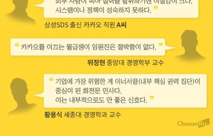 ‘직원동원논란’정모담당,최근인사에서준법경영총괄로정규돈CTO,스톡옵션먹튀논란에도2년전컴백익명신고‘핫라인제보’,2020년7건에서2024년18건으로“신뢰와헌신찾아보기어려워”…일하고싶은기업순위추락카카오는지난해8월정부주도의‘독자인공지능(AI)파운데이션모델’프로젝트5개정예팀선발에서탈락했다.이어지난해9월에는‘카카오톡’을대대적으로개편했지만,사용자들의반발로원상복구에나섰다.국민메신저‘카카오톡’은국내1위앱자리를유튜브에내줬고,AI사업은갈피를잡지못하고있다.조선비즈는현재카카오가가지고있는구조적인문제점을진단한다.[편집자주]그래픽=손민균지난해11월카카오CA협의체소속정모담당은서울의한호텔에서자녀의결혼식을올렸다.당시CA협의체소속직원들이축의대에서축의금을받아논란이일었다.당사자들은자발적으로한것이라는입장이었지만,직원들은“상사가부탁하면그게지시아니냐”“윤리를담당하는임원이이래도되나”라는반응을보였다.정모담당은이달인사에서직함만책임경영위원회위원장에서그룹준법경영담당으로바뀌었다.카카오의한관계자는“언제부터인가카카오에서는논란이있어도책임을묻지않는관행이생겼다”면서“제임스(정모담당)를등기이사로올리려한다는이야기도돈다”고했다.지난2022년삼성SDS에서카카오로이직한개발기획담당A씨.15년가량업력에도그는카카오에왔을때답답함을느꼈다.업무회의를위해사람을모으는것도,자료취합도쉽지않았기때문이다.A씨는“카카오가수평적인문화라고하지만,외부사람이녹아들어실력을발휘하기에는이질감에대한벽이크다”며“시스템이나정책이지금도성숙하지는못하다”고했다.‘카무원(카카오와공무원을합성한용어)’.급변하는인공지능(AI)생태계변화속에서카카오의임직원들을대변하는단어다.회사의발전보다는높은연봉과복지제도에안주,절박함없이안일한모습그자체다.이는김범수카카오창업자가2023년12월당시문어발논란,시세조종혐의등으로회사가사면초가에빠지자“새로운배를건조하는마음가짐으로과거10년의관성을버리고원점부터새로설계해야한다”고외친것과상반된행보다.전문가들은이런분위기가창업자의부재속에서카카오내에뿌리깊게자리잡기시작했다고진단한다.위정현중앙대경영학부교수는“김창업자는위기감이있지만카카오를이끄는월급쟁이임원진은절박함이없어보인다”며“(카카오가)위기를헤쳐나가지못한기존경영진을돌려쓰는한계상황을이어가고있다”고했다.2009년겨울,카카오톡출시를앞두고카카오전직원이참여한강원도홍천워크샵./카카오◇임원진일탈에불신·불만커져…“신뢰·헌신찾아보기어려워”카카오안팎에서는회사의성장을이끈‘카카오스러움’을대표하는키워드로수평적조직문화와자기주도성을꼽아왔다.하지만,창업자의부재속에서리더십과전략이실종되면서임원진의반복적인일탈이빚어지고있다.직원들의사기를꺾은대표적사례가정규돈카카오최고기술책임자(CTO)에대한인사다.그는2021년8월카카오뱅크CTO로근무했는데,회사가상장한지3일만에스톡옵션을행사해약66억원의차익을거두며‘먹튀’논란에휩싸였다.이후일신상이유로회사를떠났지만,카카오는2024년1월카카오CTO로그를다시불렀다.시민단체소비자주권시민회의와카카오의외부감시기구‘준법과신뢰위원회’가정CTO에대해문제를제기했지만,카카오는인사를강행했다.정CTO는올해1월임기만료로퇴사했다.임원들의도덕적해이와함께직원들의불신·불만도커지고있다.실제카카오내차별및괴롭힘,부패·뇌물등을익명으로신고하는‘핫라인제보’는2020년7건에서2024년18건으로두배이상으로늘었다.임직원들이영어이름을쓰면서수평적조직문화를표방하던전통도퇴색되고있다.카카오노조에따르면지난해8월조합원대상자체실태조사결과68%가동료에대한폭언및고압적인자세를목격했다고응답했다.카카오인사총괄부사장출신황성현퀀텀인사이트대표는“스타트업으로출발한많은회사들이시도하는수평적소통은아이디어를끌어내혁신과발상전환을위한것인데,이름을영어로바꾼다고가능해지는게아니다”라며“수평적조직에맞는일하는방법을만들어가야하는데이게쉽지않으니(수평적조직의)성과가나지않는곳이많아졌다”고말했다.카카오의한직원은“경영진부터가한탕주의가가득한데지금카카오에서신뢰와헌신은찾아보기어렵다”며“수평적문화가겉으로보기엔좋지만,윗사람입장에서는일을편히못시키고눈치보기만늘어난측면이있다”라고말했다.그래픽=정서희◇비전찾던인재들,이제는고연봉·보상제도쫓아입사기업의경쟁척도로불리는입사선호도도추락하고있다.과거카카오에입사하고싶은인재들이자신의성장가능성과카카오의비전을봤다면지금은높은급여와복리후생을매력으로느끼는모양새다.인크루트가발표하는‘대학생이꼽은일하고싶은기업’순위에서카카오는2020년부터2022년까지3년연속1위에올랐다.본인의성장과기업의미래가유망하다는이유에서다.하지만2023년과2024년순위가3위로밀리더니지난해에는6위까지떨어졌다.카카오에입사하고싶은이유도우수한복리후생,만족스러운급여와보
