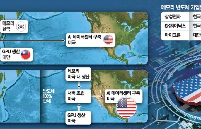 러트닉"미국에투자안하면,반도체100%관세"반도체공급망새로짜는미국HBM등메모리도美생산요구"마이크론뉴욕공장가동땐韓메모리경쟁력약화우려"업계"지방이전얘기할때아냐"삼성·SK,추가투자고민중게티이미지뱅크."한가롭게용인반도체클러스터를지방으로옮겨야한다는얘기를할때가아니다.용인에짓기로돼있는반도체팹을다미국에지어야할판이다."하워드러트닉미국상무장관의반도체관세100%발언에대해최근업계에서나오는얘기다.그동안비용문제로미국에메모리반도체팹을짓는것은비현실적이었다.하지만관세100%를부과받게되면얘기가완전히달라진다.그동안파운드리에만집중되던미국의팹건설요구가메모리반도체로확대될수밖에없다는것이다.삼성전자는이미미국내용지까지확보했다.파운드리를짓고있는텍사스주테일러시는추가용지가넓어서여기에메모리반도체팹을지으라는요구가들어올수있다는전망이나온다.100%관세가현실화되면삼성전자와SK하이닉스의메모리는미국에서생산된마이크론제품과경쟁할수없다.삼성전자와SK하이닉스가메모리반도체공장의미국이전을고민하지않을수없는이유다.삼성전자관계자는"마이크론이2030년미국뉴욕공장을가동하기시작하면한국메모리반도체기업의경쟁력약화가우려된다"고설명했다.SK하이닉스관계자는"아직관세가부과된것이아니기때문에향후정부간협상과정이어떻게될지예의주시하고있다"고밝혔다.지금까지한국메모리반도체기업들은국내에서만생산하는전략을취해왔다.중국정부의압박으로삼성전자가중국시안에낸드메모리공장을,SK하이닉스가중국우시에D램공장을지은것이유일하다.대만,미국,싱가포르,일본등에팹을짓고있는마이크론과다른전략이다.한국의전략은전세계전자산업공급망을고려한것이다.현재글로벌전자산업은한국에서대부분의메모리반도체가생산되고대만TSMC에서첨단시스템반도체가만들어진다.이두가지가중국,베트남등에서스마트폰,서버,PC등전자제품으로조립된후미국,유럽등전세계에수출되는구조다.하지만이런글로벌반도체생산분업구조가미국정부의관세와기술패권정책때문에뿌리까지흔들리고있다.미국백악관은지난14일팩트시트를통해"도널드트럼프미국대통령은반도체및그파생제품수입에대한관세를확대부과하고국내제조업을장려하기위해관세상쇄프로그램을시행할것"이라고예고했다.미국정부는전자산업생태계를미국내에구축하겠다는계획을갖고있다.특히인공지능(AI)패권경쟁에서중심이되는AI반도체생산과AI데이터센터건설을직접한다는것이핵심이다.현재반도체설계를비롯한지식재산권(IP)은엔비디아,구글등미국기업이세계최강이지만,이런반도체와AI서버가미국밖에서생산된다는것이문제였다.이미AI반도체공급망은미국내로빠르게구축되고있다.TSMC의애리조나팹이올해본격가동되면서엔비디아의블랙웰그래픽처리장치(GPU)가미국내에서생산되고있다.AI서버조립도폭스콘과위스트론등대표적인AI서버제조업체가미국에제조시설을구축하고있다.메모리반도체와고대역폭메모리(HBM)는마이크론이미국내에서제조할예정이다.이처럼AI서버제조공급망이미국내에구축되고외국산메모리반도체에100%관세가부과되면빅테크기업이미국에건설하는AI데이터센터에는미국에서생산되는메모리반도체가바로공급된다.그동안빅테크기업에메모리반도체와HBM을공급해오던한국기업의핵심시장이사라지는것이다.미국이반도체관세를어떻게부과할지에따라단기적영향도클수있다.현재한국기업의반도체는주로중국,대만,베트남등으로수출되고있다.미국반도체수출비중은전체물량의7.5%에불과하다.그러나미국이반도체뿐만아니라그파생상품인AI서버,스마트폰,패키징을마친GPU까지관세대상을확대하고미국산메모리반도체에대해서는이를면제하면한국메모리반도체는경쟁력을잃을수도있다.그런점에서향후한국과미국간'반도체관세협상'이중요하다는설명이나온다.대미자동차관세협상에서처럼디테일에서승패가갈릴수있기때문이다.먼저삼성전자,SK하이닉스등한국반도체기업이이미짓고있는생산시설을'미국내투자'로간주할지가중요하다.그래야TSMC처럼당장부과되는관세를피할수있다.한미무역협상결과조성된2000억달러규모대미투자펀드에한국메모리반도체기업의투자가포함되는지도중요하다.이를활용해야만한국정부와기업모두미국에대한투자부담이줄어들기때문이다.현재전세계적으로반도체공급이부족하고반도체관세에따른타격은미국기업이제일클수있다는점을어필해야한다는설명이나온다.안기현한국반도체산업협회전무는"국내반도체기업은국내에서경쟁력을키워야한다"며"미국과협상을지속하되국내반도체투자에속도를낼수있도록전략을구성할필요가있다"고전했다.[이덕주기자/강인선기자]Copyright©매일경제&mk.co.kr.무단전재,재배포및AI학습이용금지