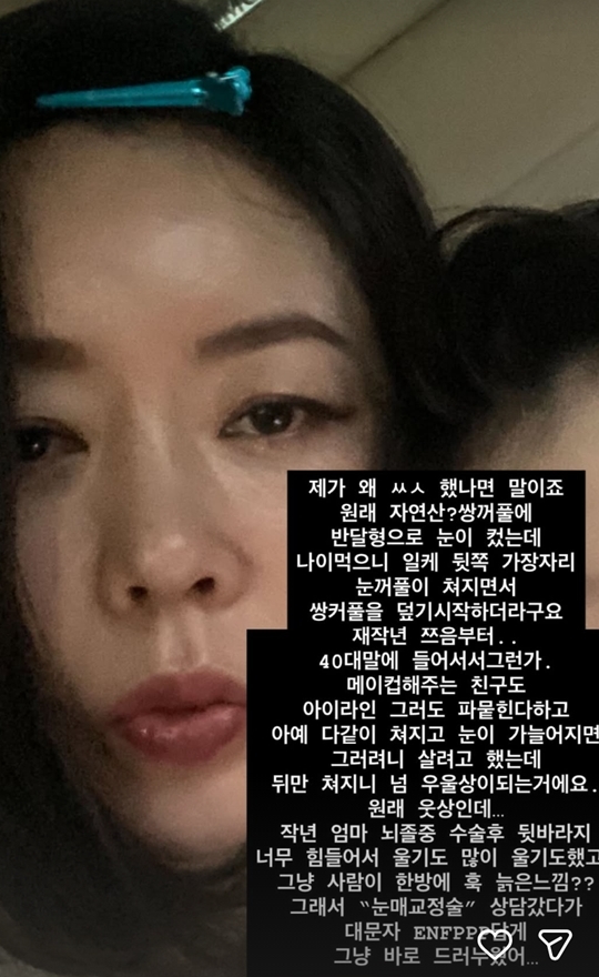 사진=안선영SNS사진=안선영SNS[뉴스엔박아름기자]안선영이쌍꺼풀수술후근황을공개했다.방송인안선영은1월17일자신의SNS에근황이담긴사진과함께쌍꺼풀수술과관련,장문의글을게재했다.앞서안선영은지난해11월27일"저사고쳤어요.나이탓인지눈꺼풀이넘쳐져서눈매교정상담갔다가대문자ENFP아니랄까봐바로드러누움.생애첫쌍수결과는.."이라며생애첫쌍꺼풀수술을받았다고고백해화제를모았다.공개된사진에는헤어스타일링도중헤어핀을꽂고카메라를보고있는안선영의모습이담겼다.먼저"제가왜쌍꺼풀수술을했냐면말이죠"라고운을뗀안선영은"원래자연산쌍꺼풀에반달형으로눈이컸는데나이먹으니이렇게뒤쪽가장자리눈꺼풀이쳐지면서쌍꺼풀을덮기시작하더라.재작년쯤부터.."라며"40대말에들어서서그런가.메이크업해주는친구도아이라인그려도파묻힌다하고아예다같이쳐지고눈이가늘어지면그러려니살려고했는데뒤만쳐지니너무우울상이되는거다.원래웃상인데.."라고회상했다.이어"작년엄마뇌졸중수술후뒷바라지너무힘들어서울기도많이울기도했고그냥사람이한방에훅늙은느낌?그래서눈매교정술상담갔다가대문자ENFP답게그냥바로드러누웠다"고쌍꺼풀수술을결정한이유를설명했다.이어안선영은쌍꺼풀이제법자리를잡은근황이담긴사진과함께"아직은두달이채안돼원래제얼굴같은느낌보다는좀너무눈에힘팍준센언니같은느낌이긴한데.."라며"원장님말씀이6개월은돼야원래나의젊었던시절눈매로돌아간느낌이될거라더라.매몰로찝은게아니고쳐진눈꺼풀절개로라인교정한거라아직도눈감으면흉살처럼보이고티가좀나긴한다.근데화장하거나사진찍으면눈이엄청또렷하니어려보이긴한것같아서빨리더자연스러워지기를기대중"이라고전했다.한편안선영은최근하키선수를꿈꾸는아들을위해캐나다로떠났다.치매투병중인모친을돌보기위해매달서울과캐나다를오가고있는것으로알려졌다.뉴스엔박아름jamie@기사제보및보도자료[email protected]ⓒ뉴스엔.무단전재&재배포금지Copyright©뉴스엔.무단전재및재배포금지.