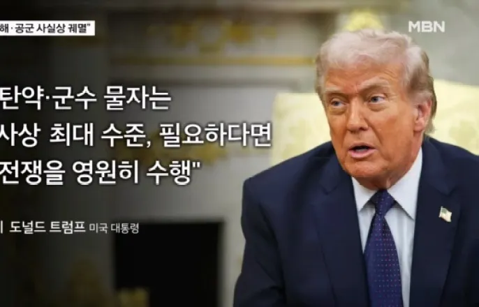 【앵커멘트】미국이이란을향한공세수위를높이는가운데,트럼프대통령이"미군은전쟁을영원히할수있다"며강한자신감을드러냈습니다.그배경이무엇인지워싱턴연결해알아보겠습니다.【질문1】강영구특파원,트럼프대통령의공세적인발언,어떤근거인가요?【기자】네,이란을향한대규모폭격이이어진가운데,트럼프대통령은미국의압도적인군사력우위를강조했습니다."미국의탄약과군수물자는사상최대수준으로비축돼있다"며,"필요하다면전쟁을영원히수행할수있다"고주장했습니다.또이란의해군과공군전력이이미상당부분타격을입었고,사실상전투능력이궤멸수준이라고평가했습니다.직접들어보시겠습니다.▶인터뷰:도널드트럼프/미국대통령-"이란은해군도,공군도,공중탐지시스템도무력화됐습니다.레이더를비롯해거의모든것이파괴되었습니다."트럼프대통령의이러한'무제한비축'발언은실제재고상황과는괴리가있다는지적입니다.특히미해군의방공요격미사일과토마호크순항미사일비축량이급격히줄었고,이는향후대만해협을비롯해다른지역에서분쟁이발생하면곤경에처할수도있다는분석입니다.즉트럼프대통령의발언은과시성격이강한정치적수사에가깝다는평가입니다.【질문2】트럼프대통령은선제공격정당성논란에대해서도입장을밝혔죠?【기자】네.트럼프대통령은지난달28일부터시작된미국과이스라엘의대이란군사작전의정당성을거듭강조했습니다."우리가먼저행동하지않았다면이란이공격했을것"이라며선제대응의필요성을주장했습니다.이는이란발'임박한위협'이실제로존재했는지를두고제기된논란을의식한발언으로,이란의핵·미사일능력을선제적으로약화시키기위한조치라는것입니다.또트럼프대통령은이번작전이미국주도로이뤄졌다는점을거듭강조하며주도권논란에대해서도반박했습니다.지금까지워싱턴에서전해드렸습니다.영상촬영:윤양희/워싱턴영상편집:한남선그래픽:김규민#트럼프#이란Copyright©MBN.무단전재,재배포및AI학습이용금지.