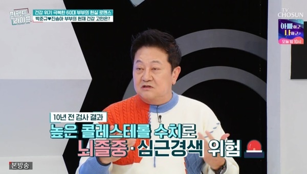 TV조선‘퍼펙트라이프’TV조선‘퍼펙트라이프’[뉴스엔유경상기자]박준규가혈관건강걱정을드러냈다.1월21일방송된TV조선‘퍼펙트라이프’에서는배우박준규(63세)와아내진송아(61세)부부가출연했다.결혼36년차박준규진송아부부는손을꼭잡고등장해신혼부부같은달달한모습을보였다.이어박준규는부부의건강고민으로“우리는항상혈관건강이고민이많이된다”며혈관건강을언급했다.박준규는“왜냐하면10년전에방송에서건강검진을하다가콜레스테롤수치가높아서뇌졸중,심근경색위험이있다는말을들어걱정을많이했다.CT촬영이심장이빨리뛰어어렵다고해서관상동맥조영술을받고심장스텐트시술을했다”고말했다.진송아는“저는남편보다먼저뇌동맥류시술을받았다.그게위험한단계에갈수있다는걸알고있었다.그런데신랑에게그런문제가생겼다고해서많이놀랐다”며남편을걱정했다.이성미가“부부가그런것도닮는다”며놀랐다.(사진=TV조선‘퍼펙트라이프’캡처)뉴스엔유경상yooks@기사제보및보도자료[email protected]ⓒ뉴스엔.무단전재&재배포금지Copyright©뉴스엔.무단전재및재배포금지.