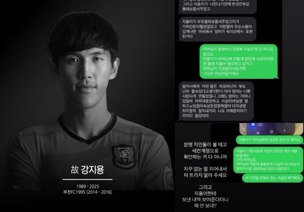 사진=부천FCSNS,이다은씨SNS갈무리[스포츠투데이김태형기자]JTBC'이혼숙려캠프'에출연했던전축구선수강지용이갑작스럽게사망한가운데,아내이다은씨가시어머니A씨와나눈문자내용을공개하며갈등이수면위로올라왔다.2일이씨는자신의SNS스토리에시어머니A씨와주고받은문자메시지캡처사진을게재했다.해당대화에는금전적인문제로갈등을겪고,양측의입장이엇갈리는모습이담겼다.시어머니A씨는"지용이가너만나기전에번것은부모몰래보증서줬고,자기가가져간돈이훨씬많았다.이런말이무슨소용이있겠냐만아쉽고속상해서표현한거다"라는메시지를보냈다.이에이씨는"어머님이말씀하신것중에사실인게단하나도없다.지용이가어머님께저렇게말한게사실이라면전평생지용이증오하고살거고어머님이거짓말하시는거면그냥안넘어갈거다"라며분노했다.A씨는이씨에게"알아서해라.이런말은속상하니까부모니까할수있다고생각한다.이미엄마는나쁜사람되게만들었지않나.그래도엄마는가만히있지않냐.아무대응안하고사실이아닐걸말하고있다"며"더이상말하지말자.잘지내라.나도이제문자여기까지하겠다.잘있어라"라고말했다.이씨는이체내역을공개하며"지용이가어머님한테입금한돈이더많다.지용이가정사중에거짓이있으면제가처벌받겠다"고반박했다.이어"그런데어머님도저한테말씀한게사실이아니라는거밝혀지면감당할수있으시겠냐.난거짓말안한다"고전했다.이와함께"분명지인들이볼테고세컨계정으로확인하는거아니까자꾸없는말지어내서퍼트리지말아달라.그리고지용이한테보낸내역보여준다더니왜안보내?"라고덧붙였다.이씨는지난달30일에도"계속해서말이바뀌고본질이왜곡되는상황이반복되고있다"며"이모든상황을지용이에게떠넘기고본인들의이미지만챙기려는모습은너무가슴아프고가증스럽기까지하다.저는더이상참지않겠다"고입장을밝혔다.이어"계속해서사실을왜곡하거나부풀려이야기하는일이반복된다면부득이하게법적인대응을할수밖에없다"고강조했다.사진=JTBC강지용·이다은부부는지난2월JTBC'이혼숙려캠프'에출연해시댁과금전문제로갈등을빚고있다고밝힌바있다.당시강지용은정신적고통을고백했으며,이씨는남편의불안정한증세로인한트라우마를털어놨다.이들은솔루션을거쳐이혼의사를철회했으나,그로부터두달만인지난달22일강지용이갑작스럽게세상을떠나충격을안겼다.갑작스러운부고소식에JTBC'이혼숙려캠프'측은애도를표하며"27~30회방송분다시보기(VOD)는비공개조치를하고있다"고밝혔다.K리그구단들도故강지용을애도했다.1989년생인故강지용은지난2009년K리그드래프트를통해포항스틸러스에지명받으면서프로축구선수로데뷔했다.이후부산아이파크,부천FC1995,강원FC,인천유나이티드FC등에서선수생활을했으며2022시즌을끝으로은퇴했다.또한고인이가수권은비의사촌오빠란사실이알려지기도했다.지난달25일발인이끝난후아내이씨는26일SNS를통해"이글을쓰는지금도눈물나고심장이미친듯뛰고찢어질듯아프다.한때미워하고원망하고헤어지고싶었던게진심은아니었던것같다"며"저는제남편을,우리아기아빠를,우리지용이를여전히사랑한다"고전했다.이어"100억을줘도지용이와바꾸기싫다.있는돈없는돈다내어드릴테니할수만있다면내지용이를다시돌려달라고하고싶다.너무보고싶다"고덧붙였다.또한이씨는"제발저희세가족에대해억측자제부탁드린다.저희부부는우리아기를정말아끼고사랑했고지금도여전히소중하고사랑한다.저희아기가커가면서상처받는일이없었으면좋겠다"고밝혔다.[스포츠투데이김태형기자[email protected]]Copyright©스포츠투데이.무단전재및재배포금지.
