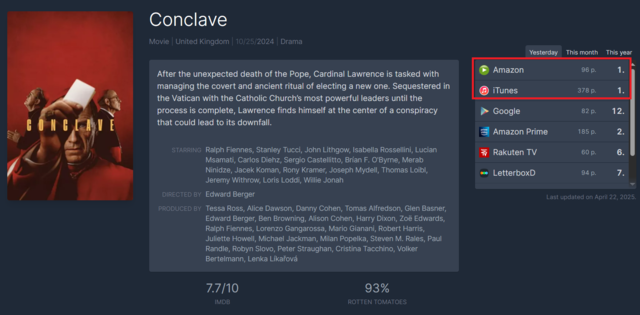 글로벌스트리밍사이트에서1위에오른‘콘클라베’프란치스코교황선종이후‘콘클라베’,‘두교황’등교황을소재로삼은영화들이새삼주목받고있다.23일글로벌스트리밍차트인플릭스패트롤에따르면극장상영을마친후현재아마존에서공급되는‘콘클라베’의순위는단숨에1위로뛰어올랐다.세부적으로는미국·영국·프랑스등6개국에서정상을차지했다.아이튠즈의경우35개국에서1위다.미주지역뿐만아니라유럽중동등에서도스트리밍횟수가급증했다.이는‘캡틴아메리카:브레이뷰뉴월드’,‘위키드’,‘미키17’,‘글래디에이터2’등쟁쟁한경쟁작을제친결과다.‘콘클라베’는노년의추기경로렌스(레이프파인스분)가콘클라베를주관하며벌어지는일을그린스릴러물이다.교황선거를야욕과추문,암투로들끓는정치판못지않게묘사하고콘클라베과정을생생하게보여준다.이와더불어지난2019년넷플릭스에서공개된영화‘두교황’역시화제다.넷플릭스에서다시검색량이늘면서서서히순위가상승중이다.‘두교황’은자진퇴위로바티칸을뒤흔든교황베네딕토16세와그의뒤를이은교황프란치스코의관계를담은작품이다.실화를바탕으로했지만,감독과작가의상상력을동원해만든허구의이야기가가미됐다.앤서니홉킨스가베네딕토16세를,조너선프라이스가프란치스코를각각연기했다.안진용기자Copyright©문화일보.무단전재및재배포금지.
