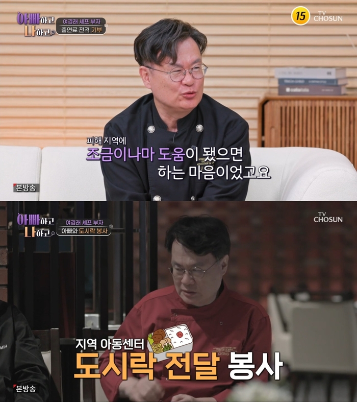 ‘아빠하고나하고’.사진ITV조선‘아빠하고나하고’방송캡처셰프여경래부자가선행에나섰다.8일방송된TV조선‘아빠하고나하고’에서는여경래와그의아들의일상이그려졌다.이날전현무는“여경래가아주큰일을했다.산불피해복구를위해프로그램출연료일부를기부했다”고입을열었다.여경래는“사실쑥스럽긴하다.큰돈은아닌데피해지역에조금이라도도움이됐으면하는마음이었다.아들과같이기부를했다”고미소지었다.여기에여경래는아들에게지역아동센터도시락전달봉사를함께하자고제안해모두를놀라게했다.아들은“10년전에갔을때는아무것도안하고따라가는입장이었다.이번에는메뉴구상까지해보라고했다”고말했다.이어“이왕하는김에이것저것잘해보자싶어서잠이안오더라.혹시망칠까봐.새벽5시반에나와서시작했다”고했다.한편‘아빠하고나하고’는매주화요일오후10시방송된다.[이세빈스타투데이객원기자]Copyright©스타투데이.무단전재,재배포및AI학습이용금지