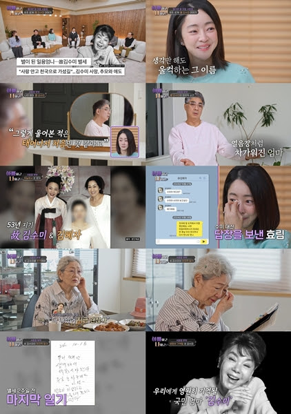 [스타뉴스|문완식기자]"수미야어디야?이담에또만나자"김혜자,하늘로보낸문자..시청자도울었다'영원한국민엄니'故김수미가세상을떠나기2주전건강이상에대해적은일기가공개됐다.25일방송된TVCHOSUN'아빠하고나하고'에서는지난10월향년75세로세상을떠난故김수미의감춰진이야기들이공개됐다.故김수미의며느리서효림,아들정명호를비롯해50년지기절친김영옥,김혜자등고인을그리워하는이들의가슴아픈사연이시청자들을울렸다.스튜디오에서는전현무,이승연,수빈,이건주,여경래,장광이함께故김수미를추억했다.묵묵히엄마의장례를치렀던故김수미의아들정명호는"발인후집에와서앉아있는데눈물이멈추지않았다.그렇게울어본건태어나서처음"이라고밝혀안타까움을자아냈다.그리고는"엄마지만때로는아빠같았고저한테는전부였다"라며故김수미를향한그리움을토해냈다.故김수미의사망당시아빠의전화를받고집으로갔다는정명호는"침대옆에엎드린엄마를들어서침대로옮겼는데몸이너무차가웠다.구급대원분들이오셨는데이미심정지된지몇시간된것같다고했다"라며엄마의죽음을목격한심경을고백했다.서효림이공개한故김수미가떠난뒤고인의휴대전화로보낸배우김혜자의문자메시지는많은이들을눈물짓게했다.'수미야어디야?','수미야보고싶다','얘기해줘'라고보낸김혜자의문자에서효림은'천국에잘도착해서이젠편안해요'라고故김수미를대신해답장을했다.김혜자는'천국에도착했다니너무나도좋아','수미야안녕이담에또만나자'라고다시문자를보내먹먹함을자아냈다.서효림은"이렇게라도대화를하고싶으셨던거다"라고말하며아직故김수미를보내지못한많은이들의마음을헤아렸다."수미야어디야?이담에또만나자"김혜자,하늘로보낸문자..시청자도울었다故김수미의본명과동명이자생전자매처럼지냈던배우김영옥이서효림,정명호의집을방문했다.김영옥은故김수미와의마지막통화내용을언급하며깊은후회를했다.지난해故김수미가건강악화로병원에입원했을당시통화를했다는김영옥은"'다나았어.지금괜찮아'라고말을하길래이제건강이괜찮구나싶었는데..."라며말을잇지못했다.서효림은"아침7시반에남편에게전화를받았다.무슨말도안되는소리냐고화를냈다"라며故김수미의부고를처음들었던상황을떠올렸다.김영옥또한"가짜뉴스인줄알았다"라며한탄했다.이날방송에서는故김수미의일기장원본이방송최초로공개됐다.16살서울에처음올라왔을때부터지난해세상을떠나기전까지60여년간꾸준히작성한고인의일기장에는아들정명호를향한끝없는사랑,절친김영옥과의추억,건강하자는다짐들이가득했다.특히그녀가세상을떠나기2주일전작성된마지막일기에는"발음이이상하고음식먹을때흘리고손을떤다"라는건강이상징후에대해적혀있어안타까움을더했다.다음주에는남편이연루된사건으로연예계활동을중단했던배우박한별과힘들었던시간을묵묵히지켜준그녀의아빠가6년만에그날의이야기를꺼내놓는다.점점꼬이는'중식대가'여경래,여민셰프의서먹한부자스토리도함께공개된다.감동의가족예능TVCHOSUN'아빠하고나하고'는매주화요일오후10시방송된다.문완식기자[email protected]©스타뉴스&starnewskorea.com,무단전재및재배포금지