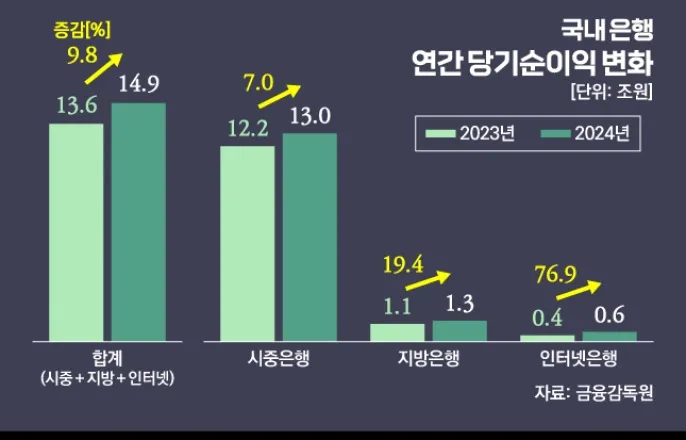인뱅3사작년순익점프…지방은행넘어서이자이익대부분이지만비이자부문도성장작년인터넷전문은행(인뱅)의실적이폭발적으로증가했다.카카오뱅크(4401억원)의경우지방은행1위인BNK경남은행(4106억원)을뛰어넘는순익을기록하고있다.순익을견인한건대부분주택담보대출(주담대)등의이자이익이었다.비이자부문도비중을확대하면서점차이자·비이자부문의균형을기대하는모습이다.금융위원회는오는25일부터제4인뱅예비인가신청을받는다.현재우리·농협은행이콘소시엄을확정한상태고IBK기업은행도막판까지참여를저울질하고있다.앞서국민은행과하나은행,우리은행도이미기존인뱅에지분참여를하고있는상태다.이때문에인뱅의성장에더욱관심을기울이고있다.17일금융감독원에따르면작년국내은행의당기순이익은총22조4000억원으로전년대비5.5%증가했다.이중인터넷은행의약진이눈에띄었다.인뱅의순익은일년새76.9%증가하며시중은행(7%)과지방은행(19.4%)의성장세를큰폭으로뛰어넘었다.'76.9%'점프배경엔…대환대출'톡톡'은행별로살펴보면카카오뱅크가4401억원의순익을기록하며전년대비24%성장한모습을보였다.케이뱅크는2023년대비10배오른1281억원을확보했다.토스뱅크의순익은잠정432억원으로첫연간흑자를기록할전망이다.이익대부분은시중은행과마찬가지로이자에서발생했다.카카오·케이뱅크는작년초시작된대환대출플랫폼의최대수혜자로꼽힌다.시중은행보다금리가낮은점을확인한고객들이몰려들며주담대등이큰호응을받았다.카카오뱅크의작년이자수익은2조482억원으로전년(2조3999억원)보다17%(3517억원)증가했다.여신잔액이(38조7000억원→43조2000억원)이증가한영향이다.특히주담대잔액은9조1000억원에서12조7000억원으로무려39.6%(3조6000억원)늘었다.이기간케이뱅크의이자이익은4815억원으로전년(4504억원)대비6.9%증가했다.케이뱅크는주담대잔액을별도로공개하지않았지만"담보대출위주로잔액이늘었다"고설명했다.토스뱅크는아직작년실적을발표하지않은상태다.연결회사인하나금융지주의감사보고서를통해잠정당기순익과영업수익등만공개됐다.인뱅중유일하게주담대를출시하지않았지만개인신용대출등에서이익을내고있다.작년3분기기준순수수료손익은-433억원이었다.커지는'비이자'…수수료·플랫폼수익'쏠쏠'인뱅과시중은행의차이점은플랫폼을기반으로한비이자부문에서크게드러났다.금감원에따르면작년국내은행의비이자이익증가율은2.9%다.2023년5조8000억원에서2024년6조원으로2000억원증가했다.인뱅은모두두자릿수증가율을보였다.케이뱅크의비이자이익증가율은81.4%에육박했다.운용수익과펌뱅킹수수료가증가한가운데플랫폼광고가본격적으로수익으로이어지기시작했다.같은기간카카오뱅크의비이자수익은25.6%(1812억원)증가했다.전체8891억원의수익중수수료·플랫폼수익이3017억원에달했다.아직실적을공개하지않은토스뱅크는비이자수익이비교적적을것으로보인다.인뱅중에서가장늦게출범한막내인데다수수료대부분을무료화해서다.토스뱅크관계자는"토스뱅크에선환전수수료나중도상환수수료등대부분의수수료가무료"라며"비이자수익원중큰부분을과감히포기했기때문에이번실적에서비이자수익이차지하는비중은크지않을것같다"고말했다.시중은행들도'이자장사'라는비판에서벗어나고자비이자부문투자를늘리고있지만,실제수익으로연결되기는어려운실정이라고설명했다.비이자이익확대의가장큰비중을차지하는펀드판매도지난해ELS손실사태이후한계에부딪힌상황이다.금융권관계자는"비이자수익을늘리기위해새로운사업에도진출하고,플랫폼화도추구하고있지만모두시간이오래걸리는일"이라고토로했다.이하은([email protected])ⓒ비즈니스워치의소중한저작물입니다.무단전재와재배포를금합니다.Copyright©비즈워치.무단전재및재배포금지.