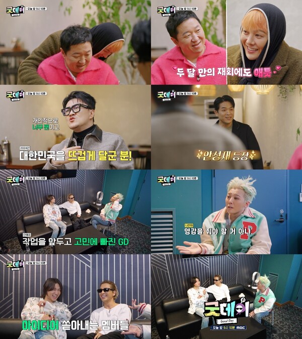 ▲9일방송되는'굿데이'에안성재셰프가출연한다.제공|MBC[스포티비뉴스=김원겸기자]MBC‘굿데이(GoodDay)’가안성재셰프에이어빅뱅멤버들을만나음악적영감을받는지드래곤의여정을예고해기대감을키운다.9일오후9시10분방송되는‘굿데이’4회에서는올해의노래를완성하는음악프로젝트를위해홍진경,안성재셰프,세븐틴유닛부석순,빅뱅등다양한분야의인물들을만나는지드래곤의이야기가그려진다.이날방송에서오랜만에다시만난지드래곤,정형돈,데프콘3인의모습이공개된다.특히지드래곤은정형돈과두달만의재회에애틋한모습을보이며여전한밀당케미를자랑한다.이를본데프콘은“영배(태양),대성이좀데려와”라며숨길수없는질투심을드러낸다.이들은음악프로젝트에함께할의외의인물과만난다.데프콘은해당인물에대해남다른팬심을드러내며“2024년대한민국을뜨겁게달군분이다.통합예능대상이있다면이분이대상”이라고강조한다.그런그가수많은예능섭외를거절하고‘굿데이’에출연한이유는바로지드래곤때문이다.정체를드러낸주인공은바로안성재셰프.“나의엔터테이너”라며팬심을드러내는데프콘과함께안성재셰프와지드래곤의첫만남이공개된다.과연이들이어떤스토리를써갈까.뒤이어등장한장면에서는지드래곤과빅뱅멤버태양과대성의만남이공개된다.태양의콘서트장을찾은지드래곤은음악프로젝트를함께할멤버들에게“나한테영감을줘야할거아냐.영감쟁이들아”라고너스레를떨며그어느때보다편안한모습을보인다.단체곡작업을앞두고파트분배등여러고민에빠진지드래곤은멤버들에게노래를걱정하는안성재셰프에대한이야기도풀어낸다.그러자태양은“노래를어려워하시면킥만치는거야”라고아이디어를내고,대성은한술더떠안성재셰프의유행어인‘이븐’EDM버전을아이디어로제시해폭소를안긴다.멤버들끼리장난스러운아이디어를던지며나온노래가찹쌀떡가사로유명한‘BAEBAE’라는사실이공개돼흥미를더한다.지드래곤은생각해둔리메이크후보곡이있냐는멤버들의질문에재해석할수있는선배들의명곡,많은사람들이다같이부를수있는곡을선곡기준으로꼽는다.과연빅뱅멤버들이추천하는‘굿데이’후보곡은무엇일까.MBC‘굿데이’는지드래곤이다양한분야의인물들과함께올해의노래를완성하는음악프로젝트로,9일오후9시10분4회가방송된다.<저작권자ⓒSPOTVNEWS.무단전재및재배포금지>Copyright©스포티비뉴스.무단전재및재배포금지.