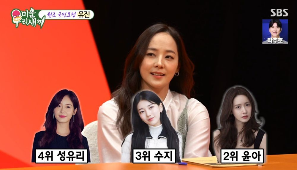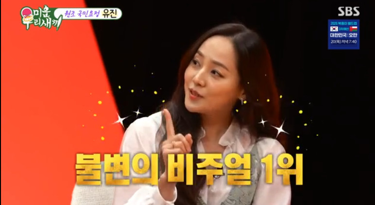 SBS'미운우리새끼'16일방송SBS'미운우리새끼'(서울=뉴스1)김보기자=S.E.S.멤버이자배우유진이미모에대해남다른자신감을드러냈다.16일오후방송된SBS예능프로그램'미운우리새끼'에는유진이스페셜게스트로출연해재미를더했다.이날유진이인사를하자패널들은"예전에볼때보다더예뻐지시고젊어지신것같다","세월이거꾸로가는것같다"라고칭찬했다.이에서장훈은"역대걸그룹센터멤버중최고비주얼을뽑는설문조사에서4위가핑클의성유리,3위가미쓰에이의수지,2위가소녀시대윤아,1위가S.E.S.의유진이라고한다"라고밝혔다.그러자유진은"데뷔이래이런조사는꾸준히있었다,중요한건단한번도1위를놓친적이없다"라고자신감을드러냈다.신동엽은이에대해"유진이가저랑도프로그램을몇번했었는데,쉬는시간에매니저한테'팀장님오늘은조사뭐나온것없어요?'라고계속물어보더라"고말해웃음을자아냈다.이에유진은카메라를향해"계속조사해주세요"라고덧붙였다[email protected]©뉴스1.Allrightsreserved.무단전재및재배포,AI학습이용금지.
