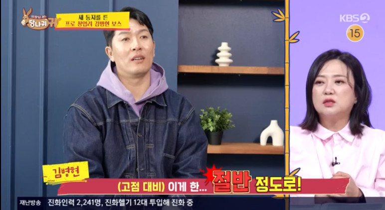 KBS2TV'사장님귀는당나귀귀'23일방송KBS2TV'사장님귀는당나귀귀'(서울=뉴스1)김보기자=전야구선수김병현이자신의새가게가매출이잘안나온다고밝혔다.23일오후방송된KBS2TV예능프로그램'사장님귀는당나귀귀'에서는방송인박명수가김병현의새햄버거가게에서식사하는장면이공개됐다.이날점심시간임에도푸드코트내입점한다른가게들은사람이많았지만,김병현의가게에는손님이전혀없었다.이때박명수가김병현의햄버거가게에방문했다.박명수는"여기가다시시작하는햄버거집이냐,점심시간인데많이팔았냐"고물었지만김병현은"형님오시기전엔바빴다,얼마나팔았는지는영업상비밀이다"라고말했다.박명수는"오픈한지한달됐는데오픈발이이렇게없냐,김병현보려고사인이라도받으러와야하는거아니냐"라고물었다.김병현은"오픈발이확실히있긴했는데매출이한참잘올라가다가일본에전지훈련다녀오며잠깐자리를비웠다,돌아와보니매출이쭉떨어져서(고점대비)절반정도로떨어졌다"라고밝혔다[email protected]©뉴스1.Allrightsreserved.무단전재및재배포,AI학습이용금지.
