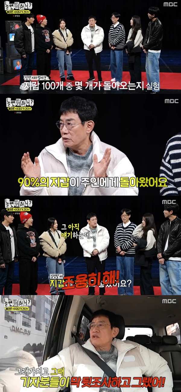 놀면뭐하니/사진=MBC방송캡처[스포츠투데이임시령기자]'놀면뭐하니?'이경규가'양심냉장고'첫회주인공을회상했다.8일방송된MBC예능'놀면뭐하니?'에는코미디언이경규가멤버들과돌아온'양심냉장고'를선보였다.이날이경규는"이번엔도로위에서양심,지하철에서볼수있는양심을찾고싶다"고말했다.이어"당시영등포역에서할머니가가방을들고내려가는데,그때누가가방을들어주는지를했다.들어준해병대청년이포상휴가를받고나중에회사에입사를했다"며"또인천지하철에서지갑100개를뿌렸는데몇개가돌아왔는지실험을했다.90%가돌아왔다.우리사회가정직한사회"라고뿌듯해했다.이를들은미주가"지갑에현금은있었냐"고하자이경규는"가만히있어라"고해웃음을안겼다.이후이경규,유재석,하하는도로위양심을찾으러나섰다.이경규는"막연하게나타날것이다하면나타난다"고말했다.그러면서"'양심냉장고'첫회에(주인공이)마지막에나타났다.새벽4시에.그래서기자분들이'짜고한거아니냐'며막뒷조사하고그랬다"고회상했다.[스포츠투데이임시령기자[email protected]]Copyright©스포츠투데이.무단전재및재배포금지.