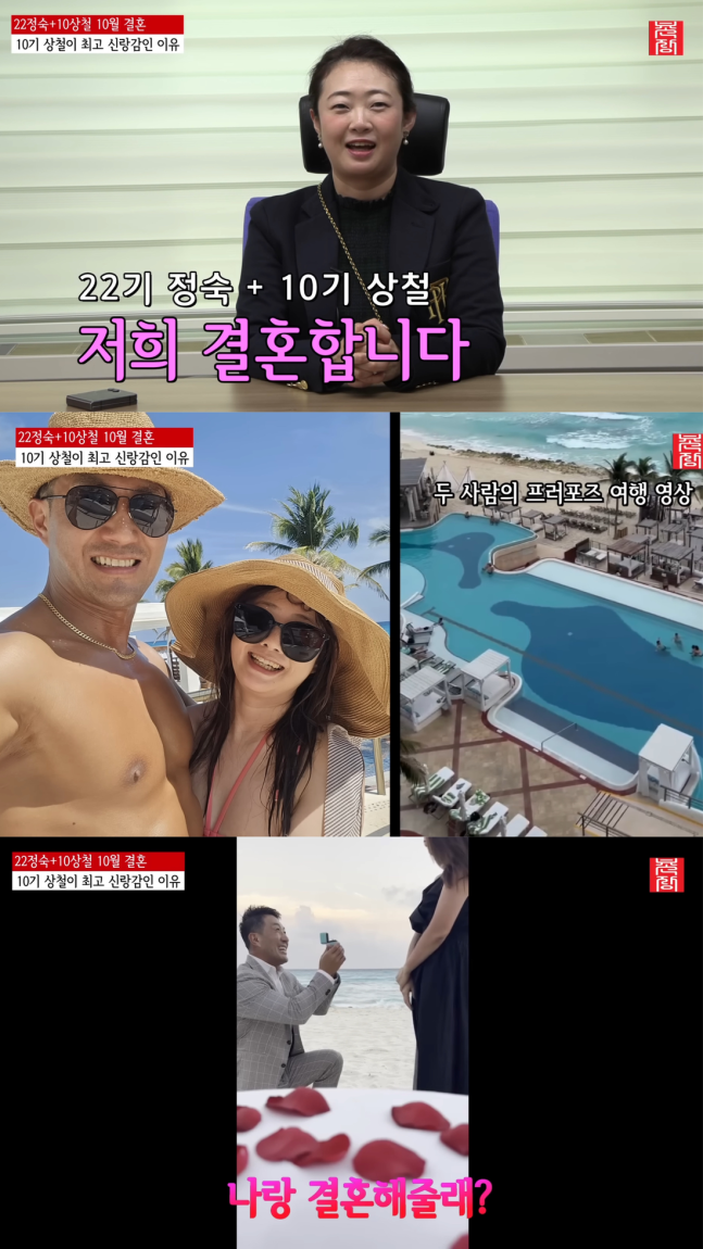 ▲출처|유튜브'촌장엔터테인먼트TV'캡처[스포티비뉴스최신애기자]'나는SOLO'22기정숙이10기상철과의결혼소식을알렸다.7일유튜브채널'촌장엔터테인먼트TV'에는'솔로나라뉴스.멕시코칸쿤해변프러포즈영상단독공개!22기정숙+10기상철결혼발표인터뷰'라는제목의영상이공개됐다.해당영상에서22기정숙은"10기상철과결혼한다"며10월25일서울강남의한호텔에서결혼식을올린다고깜짝소식을전했다.두사람은'나솔사계'촬영을마친뒤,2월초에멕시코칸쿤리조트로여행을떠났고,그때상철이정숙에게프러포즈를했다고.정숙은프러포즈당시를떠올리며"그당시바닷가앞에있는별도의야외테이블이있었다.그바로뒤에레스토랑건물이있었는데,2층에손님들이있는지몰랐다.근데거기서프러포즈를하니까그모습을지켜보던손님들이박수치면서환호를해주더라"고전했다.현재미국에서사업을하고있는10기상철때문에정숙역시"직장(변호사)그만두고미국가서살것"이라고밝혔다.그러면서"미국가서김밥장사라도해야겠다"며웃었다.<저작권자ⓒSPOTVNEWS.무단전재및재배포금지>Copyright©스포티비뉴스.무단전재및재배포금지.