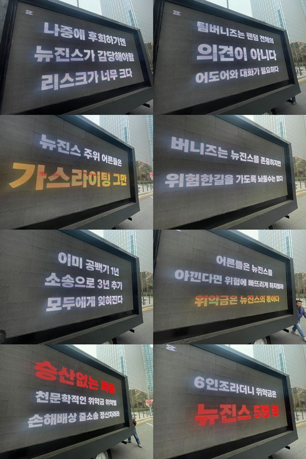 사진=트럭시위전광판[스포츠투데이윤혜영기자]그룹뉴진스의일부팬덤이최근뉴진스의행보를비판하는트럭시위를벌이고있다.버니즈회원일부는27일오전부터서울용산구하이브사옥앞에서뉴진스와어도어의화해를촉구하는트럭시위를진행중이다.트럭전광판에는'뉴진스주위어른들은가스라이팅그만''버니즈는뉴진스를존중하지만위험한길을가도록놔줄수는없다''이미공백기1년.소송으로3년추가.모두에게잊혀진다''나중에후회하기엔뉴진스가감당해야할리스크가너무크다''팀버니즈는팬덤전체의의견이아니다.어도어와대화가필요하다'등의내용이담겼다.또한'어른들은뉴진스를아낀다면위험에빠뜨리게하지말라.위약금은뉴진스의몫이다''승산없는싸움.천문학적인위약금위약벌.손해배상줄소송정신차려라''6인조라더니위약금은뉴진스5명몫'이라며위약금을걱정하는내용도포함됐다.이는어도어가제기한가처분신청이모두인용된법원판결여파다.법원은뉴진스의주장을하나도받아들이지않으며독자적활동을금지했다.이어뉴진스는23일예정된활동인홍콩컴플렉스콘을진행했으며,무대를마치고활동중단을선언했다.이와함께뉴진스멤버들은법원의결정에불복,이의신청을했다.[스포츠투데이윤혜영기자[email protected]]Copyright©스포츠투데이.무단전재및재배포금지.
