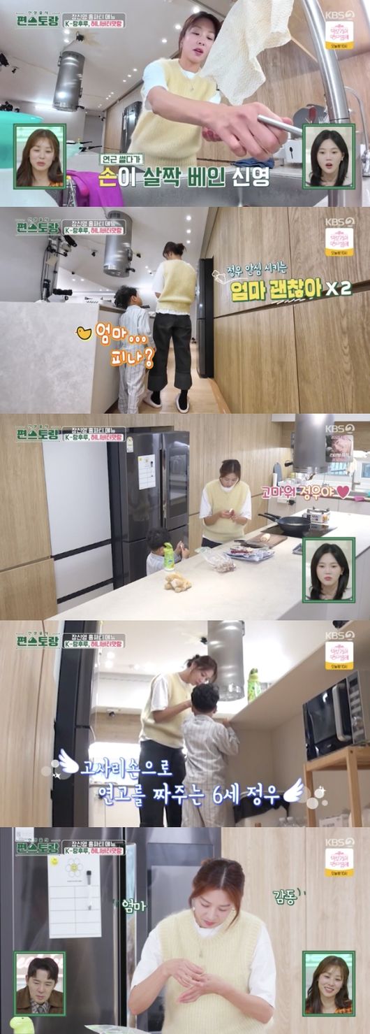 [OSEN=임혜영기자]배우장신영의아들이다정한모습으로모두의마음을따뜻하게만들었다.21일방송된KBS2TV‘신상출시편스토랑’(이하‘편스토랑’)에서는장신영이아들친구의생일파티를준비하는모습이그려졌다.장신영은음식준비중연근을손질하다가살짝손이베였다.장신영의깜짝놀란소리를들은아들은주방으로급히가“엄마피나?”하고걱정했다.괜찮다는장신영의말에아들은급하게뛰어갔고빠르게연고를챙겨왔다.장신영은“고마워정우야”라고말했다.아들은장신영을보며“혹시많이피나는거아니지?”라며다정한모습을드러냈다.그럼에도마음이편하지않은듯밴드까지가져다줬고아들은“엄마요리할때조심해”라고말해모두의심장을따뜻하게만들었다./[email protected][사진]KBS2TV‘신상출시편스토랑’Copyright©OSEN.무단전재및재배포금지.