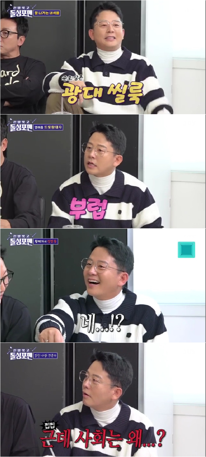 개그맨김준호가‘트로트왕자’정동원의원픽을받았다.iMBC연예뉴스사진김준호는18일(어제)방송된SBS‘신발벗고돌싱포맨-잘나가는녀석들’특집에서게스트로출격한방송인윤정수,배우지예은,가수정동원과함께유쾌한토크를벌였다.이날김준호는정동원의최애삼촌으로선택을받아시작부터이목을집중시켰다.“삼촌중에누가제일좋아?”라는탁재훈의질문에정동원이김준호를택한것.이에김준호는연신광대를씰룩였고“너잘될줄알았어”라며너스레를떨었다.그런가하면결혼을앞둔김준호의최신근황이공개되기도했다.김준호는열아홉의나이임에도서울에자가가있는정동원에게놀라움을감추지못했고,“너도결혼하면그정도가야하지않냐”는탁재훈의말에“살집이없어서동생집에서지내고있다”라고고백해짠내나는웃음을선사했다.이도잠시,그는“(삼촌이랑)같이보드게임하고놀자.삼촌좀재워주긴그렇지?”라는화룡점정멘트로현장에있던모두의배꼽을쥐게했다.정동원에질척이는김준호표악마(?)의속삭임이시청자들의웃음버튼을제대로저격했다.김준호는정동원과친분이있는임영웅의토크를이어갈때면깍듯이존대를사용하기도.“돈많으면형이지”라는폭소유발멘트로보는이들의공감을자아냈다.또한윤정수가과거김지민을미인으로꼽았다는소식을알게된김준호는질투에휩싸였다.엎친데덮친격예비신랑김준호는윤정수가자신들의결혼식사회까지욕심내자지예은의유행어“쌉쳐”를외치기도.유쾌한입담으로상황을응수한김준호의남다른센스가돋보인장면이었다.이처럼김준호는천생예능인다운재치넘치는활약으로화요일밤을들썩이게했다.명불허전개그감을풀장착한김준호의모습은매주화요일밤9시방송되는SBS‘신발벗고돌싱포맨’에서확인할수있다.iMBC연예장다희|사진출처SBSCopyright©MBC연예.무단전재및재배포,AI학습금지.