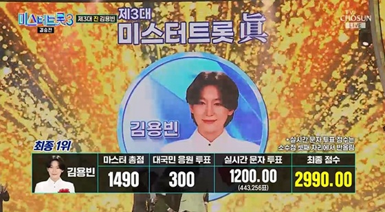 [스타뉴스|김나라기자]/사진=TV조선'미스터트롯3'캡처'미스터트롯3'가수김용빈이임영웅과안성훈을잇는'미스터트롯'3대'진'(眞),최종우승자로등극했다.13일오후생방송된TV조선'미스터트롯3'최종회12회에선대망의결승전이펼쳐졌다.앞서준결승2차전으로선정된'톱7'1위손빈아,2위최재명,3위김용빈,4위천록담(이정),5위남승민,공동6위추혁진·춘길이마지막'인생곡'미션에임했다.'미스터트롯3'진·선(善)·미(美)를가리는결승전은총3000점만점으로평가됐다.연예인마스터15명이각100점씩1500점을부여하고,1월10일부터3월12일까지온라인에서실시한대국민응원투표점수300점,실시간문자투표점수1200점이반영된다.온라인투표는총1864만963표,실시간문자투표는총206만1890표로집계됐다.다만실시간문자투표유효표수는164만1378표였다.실시간문자투표를뺀중간점수합산결과로는손빈아와김용빈이공동1위로치열한접전을벌였다.최종1위의주인공은바로,김용빈이었다.실시간문자투표는가장많은44만3256표로1200점만점을획득했다.이에그는총2990점이라는높은점수로'진'으로올라섰다.특히김용빈은3억원의우승상금을갖는주인공이됐다.2위는손빈아(2727.96점),3위는천록담(2456.76점)이차지하며각각'미스터트롯3'선·미로거듭났다.이들의뒤로는4위춘길(2201.87점),5위최재명(2176.95점),6위남승민(2165.48점),7위추혁진(1967.59점)순으로순위가매겨졌다.김나라기자[email protected]©스타뉴스&starnewskorea.com,무단전재및재배포금지