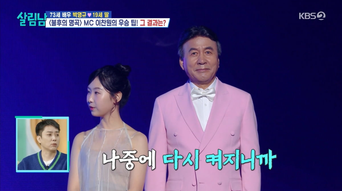 [텐아시아=김은정기자]사진=KBS2'살림하는남자들''살림남'박영규가양딸에애틋한감정을드러냈다.1일방송된KBS2TV'살림하는남자들시즌2'(이하'살림남')에서는배우박영규가4혼으로얻은딸과'불후의명곡'우승에도전했다.이날박영규는데뷔41년만에처음집공개를했다.넓고깔끔한공간에스페셜MC윤은혜도감탄했다.그의집에는딸과함께찍은힙한사진과더불어세상을먼저떠난아들사진도놓여있었다.박영규는네번째결혼과함께얻은19세딸과함께'불후의명곡'무대에도전했다.앞서두번탈락했던그는심기일전하며목관리와개인기까지연습하는모습을보였다.사진=KBS2'살림하는남자들'사진=KBS2'살림하는남자들'사진=KBS2'살림하는남자들'녹화당일2024KBS연예대상수상자이자'불후의명곡'MC인이찬원이박영규의대기실을찾아왔다.은지원은"이찬원은KBS직원이다.직원보다더오래KBS에있는것같다"고말했다.이찬원과친분이있는박서진은"살림남모니터링도해준다.잠을안자나봐"라며감탄했다.박영규에게공손하게인사한이찬원을보며딸은"할머니가되게좋아하신다"고이야기했다.유일하게외국곡을선곡한박영규가우승팁을요청하자이찬원은"반칙으로불리는기술이있다"면서관객호응,합창단대동등노하우를알려줬다.그러면서"즐기시면될것같다.워낙노래잘하시니까"라고응원했다.사진=KBS2'살림하는남자들'사진=KBS2'살림하는남자들'사진=KBS2'살림하는남자들'감동적인무대를선사한박영규와딸은아쉽게탈락했다.박영규는"아들하고이런시간을못가져봐서항상마음이아팠다.내인생에이런시간이언제다시또있겠냐.아버지로서의추억을만들고싶었다"고말했다.녹화후MC신동엽이박영규를찾아와"어려운노래는점수가잘안나온다"고위로했다.현재박영규와똑같이고2딸을키우는신동엽은양육노하우로"용돈을많이주면된다.아내한테는자동차프러포즈하고용돈안주냐.엄마몰래주라"고귀띔해웃음을안겼다.박영규는"우승은못했지만더이상바랄게없다.정말로너무너무행복했고,녹화하면서너무너무많은걸얻었다"고소감을전했다.김은정텐아시아기자[email protected]©텐아시아.무단전재및재배포금지.