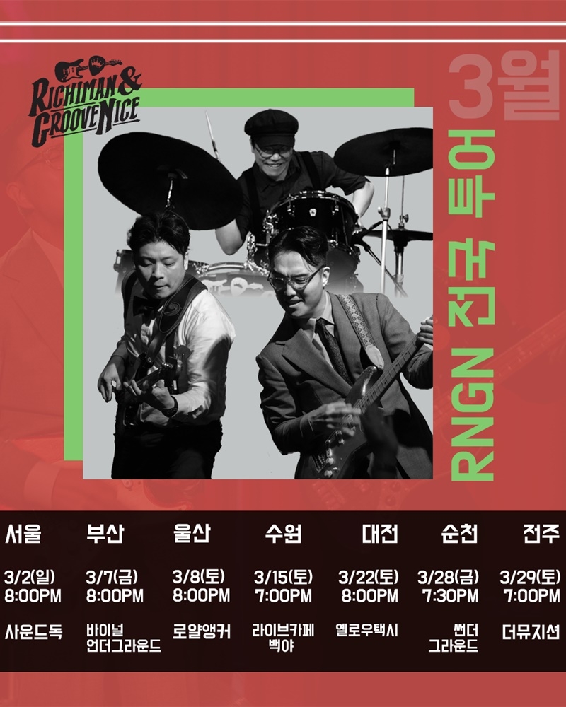 내츄럴리뮤직대한민국블루스씬을대표하는밴드리치맨과그루브나이스(Richiman&GrooveNice)가국내외투어로행보를이어간다.리치맨과그루브나이스는지난2일서울후암동사운드독에서개최된2025전국투어서울공연을시작으로7개도시전국투어를진행중이다.투어는지난2일서울,7일부산바이널언더그라운드,8일울산로얄앵커에서개최됐으며,오는15일수원라이브카페백야,22일대전옐로우택시,28일순천썬더그라운드,29일전주더뮤지션까지7개도시에서순차적으로개최된다.리치맨과그루브나이스의새로운음악세계와열정적인라이브무대를즐길수있으며,독창적인색깔을지닌밴드게스트들의무대도접할수있다.이번전국투어는그들의음악적여정을함께할수있는특별한기회로자리매김할예정이다.리치맨과그루브나이스는이번전국투어를마친후4월미국투어에돌입,국내대표블루스밴드다운탄탄한무대구성과독보적인매력으로글로벌팬들의눈과귀를매료시킬계획이다.리치맨(기타,보컬,리더),백진희(베이스),아이오(드럼)로구성된리치맨과그루브나이스는지난2022년세계블루스대회‘InternationalBluesChallenge’에서Top5에진출하며국제적으로실력을인정받았다.지난해6월첫정규앨범‘PackMySuitcase(팩마이슈트케이스)’를발매하고활발한활동을펼쳤다.리치맨과그루브나이스전국투어의자세한예매방법및공연정보는각공연장SNS및리치맨과그루브나이스SNS계정을통해확인할수있다.손봉석기자[email protected]©스포츠경향.무단전재및재배포금지.