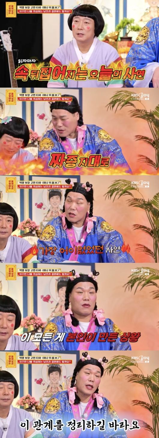 [OSEN=임혜영기자]이수근,서장훈이어이없는사연에분노했다.24일방송된KBSJoy'무엇이든물어보살’(이하물어보살)에는남자친구와결혼을망설이는여성의사연이도착했다.사연자는“포켓볼을치다가만났다.빚이많다는이유로연애를안하겠다고했지만헌신적으로구애를했다”라고말했다.이어“(남자친구가)돈도못벌고빚만400만원있었지만매달용돈을주기시작했다”라며남자친구에게물심양면쏟아부었다고말했다.사연자는남자친구에게기념일에뭔가를받은적이없다고밝혔으며남자친구는구직활동을하지않으면서요구와의심이많아졌다고.사연자는“월200,300만원을벌고용돈을받아서여유로웠다.남자친구가의심하고소리까지지르니까결혼이망설여진다.결혼을해도될까”라는고민을밝혔다.사연을읽은서장훈은“헤어져라.‘물어보살’에찾아오지않는것은본인도문제를알고있다는것이다.가장어이없는사연이다.본인이그렇게만들고있는것이다.한번와라”라고말했다.이수근은“이런여자들이데이트폭력당한다”라고말했고,서장훈은“평생을엮일것이다.제발정신차려라.빨리빠져나와라”라고조언했다./[email protected][사진]KBSJoy'무엇이든물어보살'Copyright©OSEN.무단전재및재배포금지.