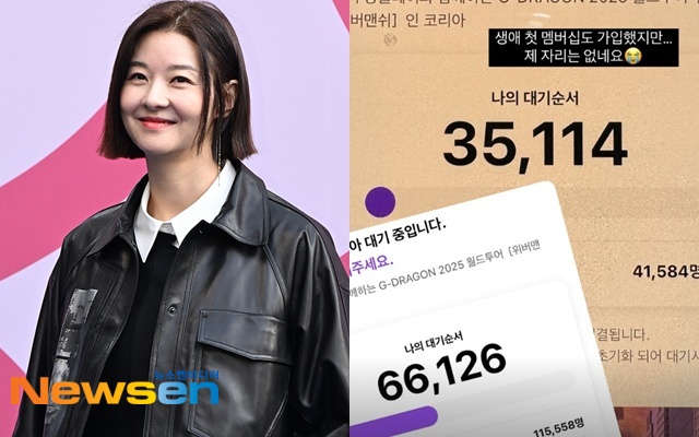 뉴스엔DB,송선미소셜미디어[뉴스엔박수인기자]배우송선미가가수지드래곤의콘서트티켓팅에실패했다.송선미는2월27일개인소셜미디어스토리에‘G-DRAGON2025WORLDTOUR'Übermensch'INKOREApresentedbyCoupangPlay(쿠팡플레이와함께하는G-DRAGON월드투어‘위버맨쉬’인코리아)가티켓팅실패인증샷을게재했다.공개된사진에따르면송선미는콘서트선예매,일반예매티켓팅에도전했으나대기번호35114번,66126번을받아들었다.이에송선미는"생애첫멤버십도가입했지만..제자리는없네요"라며아쉬운마음을표했다.한편지드래곤은오는3월29일과30일양일오후6시30분고양시일산서구에위치한고양종합운동장에서월드투어한국콘서트를개최한다.해당공연의양일6만여석은티켓오픈과동시에완판됐다.뉴스엔박수인abc159@기사제보및보도자료[email protected]ⓒ뉴스엔.무단전재&재배포금지Copyright©뉴스엔.무단전재및재배포금지.