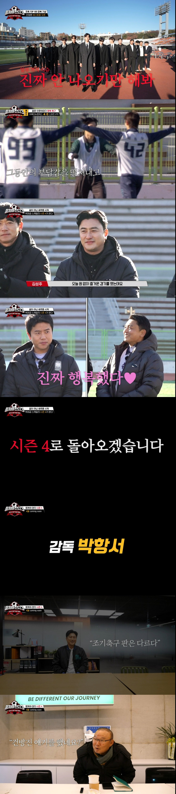 '뭉쳐야찬다3''뭉쳐야찬다'시즌4가4월출범한다.그여정을박항서감독이함께한다.2일방송된JTBC'뭉쳐야찬다'시즌3에는조기축구톱100정복기념을위한안정환레스토랑이오픈된모습이담겼다.뉴벤져스만을위한식사자리를위해감코카세가마련된것.이날메뉴는빵을곁들인수프,특제가니쉬와두번구운스테이크,제철디저트였다.메인셰프안정환은굽기단일화를추구했고뜻대로이뤄졌다.뉴벤져스는감코진이준비한음식을즐겼다.뒤이어행복축구를하기로했다.원하는포지션에투입된어쩌다뉴벤져스와스태프UTD의맞대결이었다.진지한모습으로참여했다.그럼에도어쩌다뉴벤져스의벽은높았다.4대0으로경기를압도했다.2024년6월출범해서8개월동안쉼없이달려온뉴벤져스여정이이렇게끝났다.안정환감독은"톱100정복을할수있어기뻤다.화도내고때론욕도하고굉장히우리가미울만큼싫을때도있었을텐데잘이겨내고실력으로보여준선수들에게감사하다는말을전하고싶다"라고인사했다.뒤이어'뭉쳐야찬다'시즌4가예고됐다.감독박항서가모습을드러냈다.시즌1부터시즌3까지조기축구판을직접경험해본안정환은"제가얘기할수있는건조기축구판은다르다는것"이라며경험어린조언을건넸다.박항서감독은"건방진얘기를했네요?이길자신이있대요?내가안정환이한테는이길수있어요.진짜로"라며강력한승리의지를피력,긴장감이감돌게했다.'축구장에두개의태양은없다'라는자막과함께'뭉쳐야찬다'시즌4는2025년4월돌아올것을예고했다.황소영엔터뉴스팀기자[email protected](콘텐트비즈니스본부)Copyright©JTBC.무단전재및재배포금지.