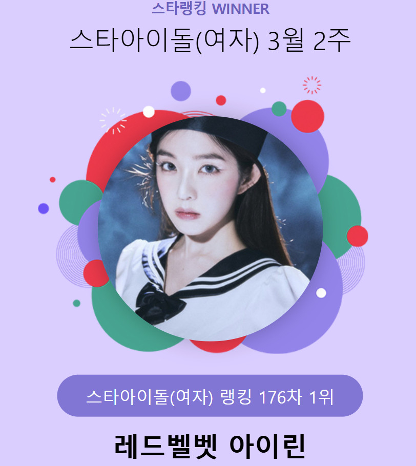 [스타뉴스|김나라기자]/사진=스타뉴스그룹레드벨벳리더아이린이스타랭킹스타아이돌여자부문에서1위를차지했다.아이린은지난6일오후3시1분부터13일오후3시까지진행된3월2주(176차)스타랭킹스타아이돌여자부문랭킹투표에서1만6443표로1위에올랐다.아이린의뒤로는2위소녀시대멤버겸윤아가5534표를받으며2위를기록했다.3위또한같은소녀시대인태연으로그는3152표를나타냈다.4위에는우주소녀출신연기자보나(김지연)가2518표로이름을올렸다.한편스타랭킹은팬들이직접자신의최애스타에투표해순위를결정하는랭킹투표다.모바일에서투표를할경우투표인증서도받을수있고투표결과순위에따라스타에게다양한특전이제공된다.4주연속1위로선정된스타는옥외전광판광고에실린다.4주연속1위스타의팬들은옥외전광판광고영상팬서포트도가능하다.제안은스타뉴스공식이메일([email protected])로하면된다.김나라기자[email protected]©스타뉴스&starnewskorea.com,무단전재및재배포금지