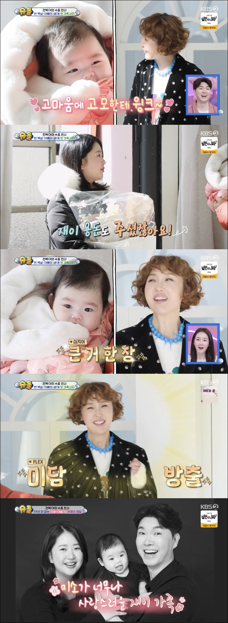 (엑스포츠뉴스이유림기자)방송인최은경이박수홍,김다예부부딸재이에게용돈을준사실이밝혀졌다.12일방송된KBS2TV‘슈퍼맨이돌아왔다’564회는‘오로지너만의슈퍼맨’편으로박수홍이생애첫가족사진촬영에나서며다양한콘셉트의의상을입고특별한순간을기록했다.이날품에재이를안은박수홍은"정식으로생애처음외출"라며최은경을만났다.박수홍과22년간의우정을나누고있는최은경은자신이가족들과함께찍었던스튜디오에서박수홍역시가족사진을찍길바라는마음에선물을준비했다.박수홍은"아내하고저하고헤어스타일링,메이크업예약까지잡아줬다.재이랑같이100일기념사진찍게해줬다"라고고마움을표했다.최은경은재이를보더니"너도예쁘게찍을거야"라고말을걸었고,재이는눈을감으며마치윙크하듯해귀여움을자아냈다.김다예는"지난번에재이용돈도주셨다.깜짝놀랐다"고말했고,박수홍은"재이의용돈을제일먼저줬다.그것도큰거한장"라며덧붙였다.사진=KBS2TV방송화면이유림기자[email protected]©엑스포츠뉴스.무단전재및재배포금지.