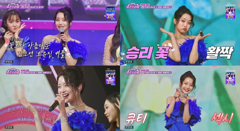 TV조선‘미스쓰리랑’방송캡처가수김소연의사랑스러운매력이폭발했다.김소연은지난12일에방송이된TV조선‘미스쓰리랑’에출연해‘중.꺾.마(중요한건꺾이지않는마음)’특집을꾸몄다.김소연은4라운드에서오유진과함께출격해“팬분들께서저희가항상꽃보다아름답다고한다”며배일호의‘꽃보다아름다운너’무대를예고했다.이어진무대에서김소연은블루미니드레스스타일링으로곡명과걸맞은러블리비주얼을드러내시선을압도했다.김소연의큐티와섹시를오가는팔색조매력또한관객들을매료시켰다.김소연은꽃을닮은다채로운표정연출과깜찍한퍼포먼스를더해보는이들을미소짓게했다.무대내내뿜어져나오는김소연특유의사랑스러운에너지와잔망스러운무대매너가관객들의뜨거운환호를이끌어냈다.가사에충실하며,세밀한표현력과흔들림없는가창력또한김소연의‘믿고보는’무대를완성했다.시원한고음처리와애교가득한보이스가김소연만의존재감을제대로각인시켰다.오유진과의호흡역시돋보였다.두사람은서로를향해따뜻한눈빛을주고받으며,찰떡케미스트리로완벽한듀엣무대를완성해보는이들의훈훈함을자아냈다.김소연은‘미스트롯3’에서탁월한보컬실력은물론,밝은미소와비타민같은매력으로주목받아TOP7에올랐다.다양한방송프로그램및콘텐츠를통해활발한활동을펼치며팬들과소통하고있다.손봉석기자[email protected]©스포츠경향.무단전재및재배포금지.