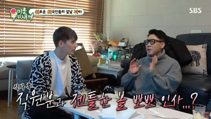 (엑스포츠뉴스황혜윤기자)'미우새'이상민이파비앙에게프랑스볼뽀뽀문화가레스토랑직원에게도적용되는지물었다.2일방송된SBS'미운우리새끼'에서는이상민이설날을맞아한국생활30년차인인도인럭키,한국생활19년차인프랑스인파비앙,한국생활8년차인호주인조셉을만났다.이들은럭키의집에모여'설날파티'를진행했다.이상민은"항상설날을외롭게보내는데,설날파티는처음해본다"고말했고,럭키는"잘오셨다.우리'외외파'가'외로운외국인들의파티'"라고설명했다.이날이상민은파비앙에게"프랑스에여행갔을때,레스토랑에서의식사후직원에게볼뽀뽀인사를하면직원도같이(볼뽀뽀를위해)움직여주냐"면서프랑스의볼뽀뽀인사문화에대해물었다.이에파비앙은"직원에게요?직원에게(볼뽀뽀하면)잡혀간다"면서"모르는사람에게하면안된다"고대답해모두를웃게했다.한편이상민은조셉에게"아내분이한국사람이시지않냐"면서"한국의설명절엔가족들과함께있어야돼서여기오면안되는데?"라며왜설날파티에참석했는지물었다.조셉은"원래와이프"라고망설이며"이런소식나오면괜찮을지모르겠지만"이라며난감해했다.럭키는"(조셉이)결혼안했을때야같이놀자고불렀지만,결혼하고나서는연락하기가어려웠다"고말했다.그러나조셉이그에게"형제발좀불러줘"라고연락을했다고말하며집에서나오고자하는지구촌유부남본능을선보였다는설명이다.조셉은'흑백요리사'에출연했던백수저셰프답게설날을맞아'외외파'의사람들에게다양한음식을선보이기도했다.조셉은음식을만들며느끼함을잡기위해김치를활용한다며김치를꺼냈다.김치를본럭키는"김치싸대기하기딱좋다"며감탄했고,파비앙은"각나라에는싸대기가있는데,프랑스는바게트싸대기"라고말했다.이어럭키는"인도는탄두리싸대기"라고답하며MC들의폭소를자아냈다.이날럭키는"한국인여자친구도만나고결혼할기회도있었는데,때를많이놓쳤다"고말하면서"얼마전에인도를다녀왔다.그런데엄마의'인도여자랑결혼하는거어때'라는제안을듣고인도여자와결혼하는상상을했는데국제결혼을하는느낌이었다"고말해웃음을유발했다.이상민은럭키에게"인도결혼은저녁에시작해서며칠동안정성들여했다가헤어질땐일정이좀짧냐"며인도의결혼및이혼문화에대해물었다.이에럭키는"인도에서는농담으로'크게결혼해야이혼하기쉽지않다'고말한다"면서인도의이혼율이낮다고말했고,이상민은"그래서(인도에)가고싶다"고말하기도했다.사진=SBS방송화면황혜윤기자[email protected]©엑스포츠뉴스.무단전재및재배포금지.