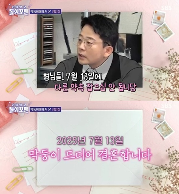 돌싱포맨김준호/사진=SBS방송캡처[스포츠투데이임시령기자]'신발벗고돌싱포맨'김준호가청첩장을전달했다.11일방송된SBS예능프로그램'신발벗고돌싱포맨'에서는배우이종혁,유선,김윤지,윤현민이게스트로출연했다.이날게스트가등장하기앞서김준호는'돌싱포맨'멤버들에게"7월13일에다른약속잡으면안된다"며청첩장을건넸다.이에이상민은"근데결혼식장계약금이없어서이혼을할뻔했다더라"며"돈이없어서준호가도망을가고지민이가돈을냈다고"라며자초지종을물었다.이를들은김준호는"계약하는날돈을내는건줄몰랐다"고해웃음을안겼다.한편,김준호는약3년째공개열애중이던연인김지민과올해7월13일결혼식을올린다.[스포츠투데이임시령기자[email protected]]Copyright©스포츠투데이.무단전재및재배포금지.