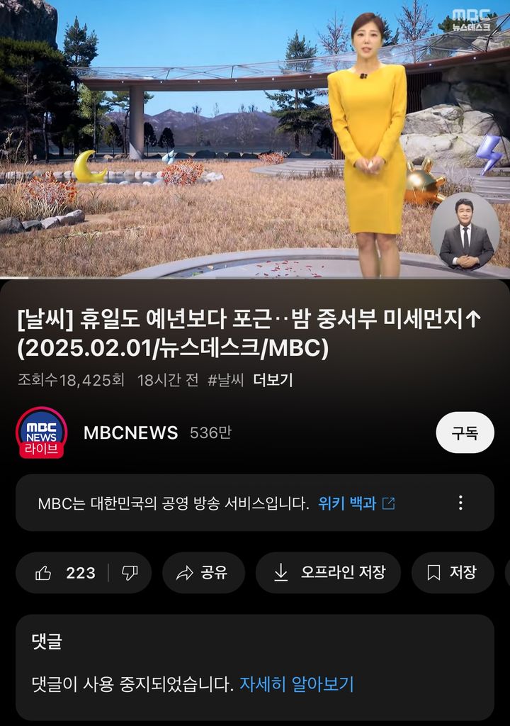 [서울=뉴시스]MBC날씨뉴스클립.(사진=유튜브캡처)[email protected]*재판매및DB금지[서울=뉴시스]이재훈기자=작년9월세상을떠난MBC기상캐스터오요안나(1996~2024)에대한사내괴롭힘의혹이불거진가운데여파가계속되고있다.2일방송가에따르면,MBC뉴스유튜브채널에올라오고있는날씨클립댓글사용이현재중지된상황이다.전날방송된'뉴스데스크'의날씨뉴스를진행한모기상캐스터등의날씨예보영상이올라왔지만,이에대한누리꾼의반응은확인하기힘든상황이다.일부누리꾼들이MBC기상캐스터들과이들이속한보도국과학기상팀,MBC등에대한비판과각종추측성의발언을달고있기때문인것으로보인다.해당건의여파는MBC기상개스터출신들에게도이어지고있다.MBC기상캐스터출신이문정은전날소셜미디어에"뭐든양쪽얘기를다듣고판단해야하는거아닌가.한쪽얘기만듣고극단으로모는사회.진실은밝혀질거야.잘견뎌야해!"라고썼다가가해자들두둔하는게아니냐는비판을받았다.이문정은이날"제가올렸던스토리는오요안나씨와관련없는개인적인생각을쓴글"이라고해명에나서기도했다.이와별개로오요안나의명복을비는MBC기상캐스터출신들도나오고있다.방송인으로전향한박은지는소셜미디어에"MBC기상캐스터출신으로너무마음이무겁다.본적은없는후배이지만지금쯤은고통받지않길바란다.삼가고인의명복을빈다.언니도7년이라는그모진세월을참고또참고버텨봐서알지.그고통이얼마나무섭고외로운지.도움이못돼줘서너무미안하다"고썼다.오요안나유족은지난달31일한유튜브채널에고인을괴롭힌것으로추정되는가해자의실명을공개해해당건의파장은일파만파커지고있다.앞서대구·경북지역종합일간지매일신문은지난달27일"비밀번호가풀린오요안나씨의휴대전화에서원고지17장분량총2750자의유서가발견됐다.유서엔특정기상캐스터2명에게받은직장내괴롭힘피해를호소하는내용이담겨있었다"고보도했다.이후의혹이커지자,MBC는이와관련진상조사위원회를구성했다.곧조사에착수한다.오요안나의사망원인은그간알려지지않았다.아이돌연습생출신인그녀는2019년춘향선발대회에서숙으로당선됐다.2021년MBC공채기상캐스터로뽑혔고,평일·주말뉴스날씨를맡았다.tvN'유퀴즈온더블럭'에출연하기도했다.☞공감언론뉴시스[email protected]©뉴시스.무단전재및재배포금지.