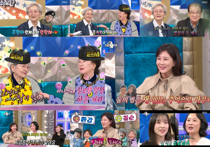 ‘라디오스타’에출연한배우김영옥,나문희,양정아,김재화,김아영이입담과재치,개인기까지다갖춘‘만능재주꾼들’로활약했다.각종시상식에서‘수상’의영광을얻은이들의활약도‘수상감’그자체였다.iMBC연예뉴스사진지난5일방송된MBC‘라디오스타’(기획강영선/연출김명엽황윤상)는김영옥,나문희,양정아,김재화,김아영이출연한‘’수상’한그녀들’특집으로꾸며졌다.‘인생절친’인김영옥과나문희는64년을함께한‘우정’을빛냈다.MBC공채성우1기로시작해연기인생을함께한이들은오랜우정이만들어낸편안한분위기속에서진심이담긴이야기와‘솔직함만렙’의입담을선보였다.‘할미넴’김영옥은거침없는언변으로모두를사로잡았다.나문희가영화'소풍'홍보차김어준이진행하는프로그램에출연했다가'좌파'라는말을들었던것과관련해김영옥은"나도나문희랑친하다고좌파라고하더라”고운을뗐다.그는“우리는좌파,우파이런거잘모른다.그냥나라가어수선한게너무슬플뿐이다.일제강점기를거쳐서해방의기쁨,6.25까지다겪고여기까지왔는데,너무슬프다"고의미있는한마디를남겼다.김영옥과나문희는지난해함께출연한영화‘소풍’으로공동여우주연상을받기도했다.그는상을받은뒤‘힙합의민족’에서자신의랩선생님이었던몬스타엑스주헌에게연락이왔다며“여자친구가없는지,노인네한테그렇게연락을한다”고흐뭇한모습을보였다.특히김영옥은시상식을언급하면서‘부상’이있었으면좋겠다는발언과함께,국내시상식이해외시상식처럼신구배우들이모두모여화합하는장이됐으면좋겠다는바람을드러내눈길을끌었다.또그는배우이순재가지난해‘KBS연기대상’에서대상을받은것을보며눈물을흘렸다면서"마음이아팠다.대상을처음타봤다는데그것도이상했다.어떻게해서비껴갔는지.말씀중에당신이하고싶은말을다한것같아공감됐다"고해짠한감정을자아냈다.나문희는섹시함의대명사‘마릴린먼로’의전담성우였다고밝혀눈길을끌었다.당시성우활동으로작품을많이보고연기연마를많이했다는나문희.그는영화‘아이캔스피크’로국내3대영화제에서여우주연상을모두받은이야기를꺼내며“상복이있나보다”라고말해웃음을유발했다.또한과거다양한작품을통해김영옥과연기호흡을맞췄던에피소드와자신에게의미가있는작품등을밝히며연기인생을회고하는듯했고,그런그의변함없는연기열정에모두가존경심을드러냈다.한편양정아는‘우리들의천국’,‘종합병원’,‘M’에출연하며주목을받은과거가공개돼눈길을끌었다.또한예능프로그램에서‘예능의신’이내려‘가슴불꽃쇼’를했던영상도공개돼스튜디오를웃음으로초토화시켰다.오랜친구인배우김승수와의관계에도큰관심이쏠렸다.양정아는김승수와생년월일까지똑같다는얘기를꺼냈고,그와의‘방송썸’으로인해연애세포가살아났다고해시선을집중시켰다.최근에는김승수와호텔에서결혼한다는소문까지났다고밝히기도.이어그는김승수와현재관계에대해“지금은그냥친한친구로돌아왔다”라며‘구방송썸녀’로서김승수가좋은인연을만나면진심으로축하할마음임을드러냈다.최근연기와관련해서는“‘언니는살아있다’할때세상에서들을욕은다먹은것같다”고고백한양정아.그는“사실그때힘든시기였다.아버지가편찮았고어머니도대장암에걸리셨다.19년동안키운강아지도무지개다리를건넜다.또이혼소송중이었다”고털어놔안타까움을자아냈다.하지만그는“온갖스트레스를다받으니까그런감정들을연기에다쏟아냈다.개인사는복잡했는데드라마가잘돼서좋았다”라며긍정에너지를보여줬다.김재화는배우집안의장녀로세자매의‘공동수상기’가큰웃음을자아냈다.그는"'지옥에서온판사'에저희세자매가같이출연했다”면서“처음둘째혜화가감독님과전작영화를같이찍으며연이돼형사역할로캐스팅됐다”고했다.이어그는감독의제안으로세자매가한드라마에함께출연하게되었고,‘SBS연기대상’에서자매들이공동수상하는기적같은순간을맞았다고전해모두를놀라게했다.특히김재화는조연역할을많이맡아‘조연병(?)’이생긴탓에,수상소감에서둘째아들에대한마음을제대로전하지못해아들이서운해했던사연을털어놓았다.‘SNL’에서활약을펼친김아영은연기에대한욕심이커졌던얘기를꺼냈다.그는이에드라마연기에도전하고싶어드라마에하나씩하나씩출연하기시작했는데,‘누구옆의걔’로불렸던현실을얘기했다.그렇게만난‘지옥에서온판사’에서연기포텐을터트린김아영은‘SBS연기대상’에서우수상을받은것에대해예상치못했다며감격한모습을보였다.그는특히한살차이가나는친오빠가회사없이혼자일하던당시일을도와줬던사실을밝혔는데,멘털케어를많이해준다며고마움을드러내눈길을끌었다.또김재화가자매들과하는연기연습인‘마이즈너레피티션’특강을받으며실전훈련을했는데,다행히여유를되찾으며마무리해앞으로펼쳐질연기생활을기대케했다.다음주'라디오스타'905회는박경림,선예,하원미,정동원이출연하는‘무제한도전’특집이예고돼기대를모은다.한편,라디오스타’는MC들이어디로튈지모르는촌철살인의입담으로게스트들을무장해제시
