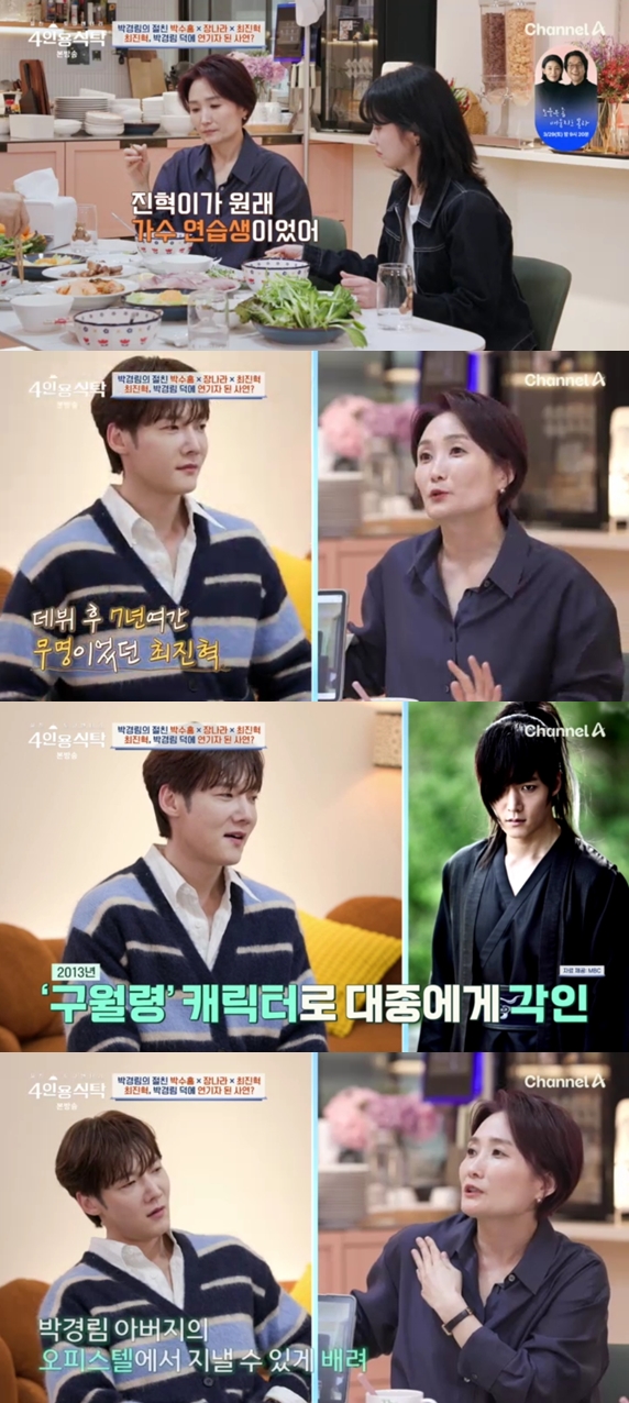 '절친토큐멘터리4인용식탁'24일방송채널A'절친토큐멘터리4인용식탁'채널A'절친토큐멘터리4인용식탁'(서울=뉴스1)박하나기자=배우최진혁이방송인박경림과의특별한인연을언급했다.24일오후8시10분에방송된채널A'절친토큐멘터리4인용식탁'(이하'4인용식탁')에서는박경림이박수홍,장나라,최진혁을초대해특별한4인용식탁을꾸렸다.박경림과소속사선후배로만난21년지기최진혁.최진혁은가수를꿈꿨던소속사연습생시절,배우의길을권유한박경림의조언덕분에연기자가됐다고밝혔다.이후최진혁은데뷔후7년여간무명의시간을보내다드라마'구가의서'속구월령캐릭터로대중에게이름을각인시켰다.최진혁의데뷔과정을지켜봤던박경림은"당시진행하는라디오에최진혁이단독출연했는데소개하면서눈물이났다"라고고백했다.서울에상경해아무것도없던최진혁에게박경림의부모님도많은도움을줬다고.최진혁은"4~5년전,(박경림)누나어머니를혼자찾아뵌적이있다"라며때마침박경림본가근처에서촬영중가벼운마음으로용돈을챙겨박경림의어머니를찾아갔다고밝혔다.최진혁은"어머니께서펑펑우셨다"라며"저도눈물이나서도망쳐나왔다"라고고백했다.박경림은19세때부터봐왔던최진혁이기특했을것이라며"진혁이어머니도매달참기름을보내주신다,통깨,홍어무침,전복장아찌등도보내주신다"라고두가족의특별한관계를전했다.한편,채널A'절친토큐멘터리4인용식탁'은절친들의생생한증언으로새롭게각색하는스타의인생이야기를담은프로그램으로매주월요일오후8시10분에방송된다[email protected]©뉴스1.Allrightsreserved.무단전재및재배포,AI학습이용금지.
