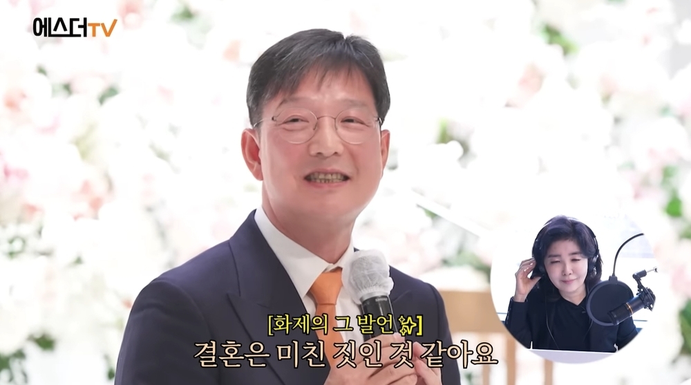 ‘에스더TV’영상캡처‘에스더TV’영상캡처[뉴스엔박수인기자]피부과전문의함익병이홍혜걸,여에스더의큰아들결혼식에서축사를맡았다.최근채널'에스더TV'에는여에스더가큰아들과의사집안딸인며느리의결혼식1년만에당시영상을보며회상하는모습이그려졌다.영상속홍혜걸과절친한함익병은2부축사에서마이크를든채"이두친구의결혼에대해진심으로축하드리고제가한마디드린다고하면이얘기를하고싶다.저도결혼한지가거의한40년다돼가는데살아보니그런것같다.결혼은미친짓인것같다.정말결혼은미친짓인것같다.그래서젊은사람들이너무똑똑하기때문에결혼을안하는것같다"고운을뗐다.이어"그런데이두젊은남녀는용감하게서로에미쳐버린것같다.그래서일생을살아가는동안에다시는지금과같은맑은정신으로돌아오지말고미친마음으로생이다하는그날까지정말재밌게,멋지게살아가주길바라며행복하게다복한가정이이뤄지기를바란다"고전했다.뉴스엔박수인abc159@기사제보및보도자료[email protected]ⓒ뉴스엔.무단전재&재배포금지Copyright©뉴스엔.무단전재및재배포금지.