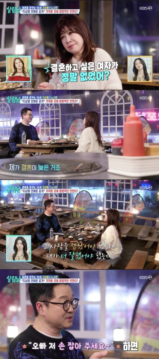 KBS2TV'살림하는남자들시즌2'지상렬이결혼하고싶었던여자가있었다고털어놨다.1일방송된KBS2TV'살림하는남자들시즌2'에는지상렬과노사연이연애에대한이야기를나누는모습이그려졌다.지상렬은노사연에게첫사랑에대해물었다.노사연은"체육선생님이다.너무멋있는데내일점심시간에체육실로오라더라.내눈을보는것이다.떨려서나도봤다.선생님이'그동안쭉지켜봐왔다.너투포환한번해볼래?'(했다)"라고말해웃음을자아냈다.노사연은"정말결혼하고싶은여자가없었냐"라고물었고지상렬은"있기야있었다.제가늦은것이다"라고답했다.노사연은"골든타임을놓쳤네.후회하겠다"라고안타까워했다.지상렬은"맨날이야기하지만표현을못하는것이다.좋아하면얘기를해야하는데"라고속상해했다.지상렬은"'오빠저손잡아주세요'하면'손?왜?'이런다.가끔가다탄력받으면'손'이런다"라고말했다.노사연은"상렬이장가가는건끝까지포기하지않을것이다"라고응원했다.박다영기자[email protected]©머니투데이&mt.co.kr.무단전재및재배포,AI학습이용금지