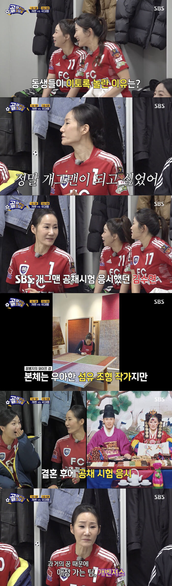 [SBS연예뉴스|김효정에디터]김병지의아내김수연의과거가모두를놀라게했다.5일방송된SBS'골때리는그녀들'(이하'골때녀')에서는김수연이독특한이력을공개했다.이날방송에서개벤져스와경기를앞둔국대패밀리의모습이그려졌다.경기전김수연은개벤져스에애정을갖는이유를밝혔다.그는개그맨이되고싶어SBS개그맨공채시험에응시했었다고밝혀모두를놀라게했다.이어그는당시자신이기획했던콘티도공개해눈길을끌었다.이에멤버들은"반전이다.생각지도못했다"라고놀랐다.우아한섬유조형작가로활동하고있지만개그본능이숨겨져있었던것.이에김수연은"사람은보는거랑참다를수가있다"라며너스레를떨었다.또한그는김병지와결혼후공채시험에응시했었다며"시험보러갈때응원도해주고그랬다"라고설명했다.이어김수연은"그래서개벤은조금애정이가는팀이긴한데오늘은내려놓고승부를할거다"라고각오를밝혔다.Copyright©CopyrightⓒSBS.Allrightsreserved.무단전재,재배포및AI학습이용금지