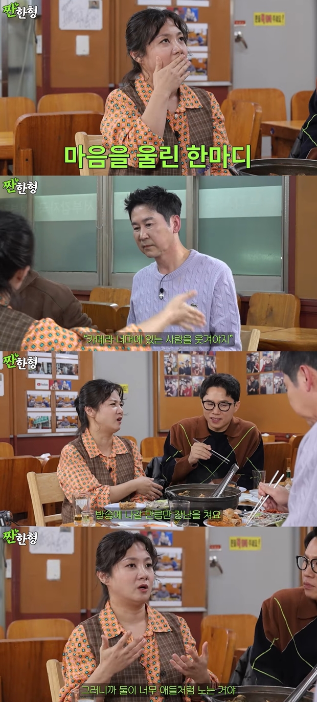 티브이데일리포토[티브이데일리김진석기자]코미디언박나래가'동엽신'신동엽에게존경심을표했다.3일저녁유튜브채널'짠한형신동엽'에는'고삐풀린텐션!감자탕집에서또레전드갱신'이라는제목으로코미디언박나래,양세형이출연한영상이게재됐다.특히이날박나래는신동엽에대해"예능을하고싶었던그시절부터내롤모델"이라며"난여동엽이될것"이라고강조했다.이어박나래는자신의마음을울렸던신동엽과의일화를공개했다.박나래는"동엽신이기억할지모르겠는데,그런얘기를했다.'나래야.네가웃길사람은거기현장에있는사람이아니고,카메라너머에있는시청자'라며거기에취해있지말라더라"라고회상했다.이어"사실개그맨들은현장에있는사람들이막웃어주면신나서하지않냐.하지만생각해보면그게다가아닌데그거에되게취해있는거다.나역시그땐너무취해있었다"라고털어놨다.그러면서"동엽신이'나래야이젠네가알아야한다'고하더라.내가원래도동엽신을너무좋아했지만,그때는거의'난이사람을그냥믿고무조건가야겠다'싶더라"라고진심을건넸다.또한박나래는양세형과개그계대표찐친다운티격태격케미스트리를마음껏뽐내시청자들에게웃음폭탄을선사했다.특히오디오빌틈없는환상적인티키타카입담으로재미를배가시켰다.박나래는양세형에대해"은근히젠틀한게,방송에나갈만큼만장난을친다"고밝혔고,양세형은"근데방송없을땐,얘랑하는행동에대해개그맨들도말린다"라고너스레를떨었다.그러자박나래는"둘이너무애들처럼논다"고폭로해웃음을자아냈다.[티브이데일리김진석기자[email protected]/사진=유튜브'짠한형신동엽']박나래[Copyrightⓒ*세계속에新한류를*연예전문온라인미디어티브이데일리(www.tvdaily.co.kr)/무단전재및재배포금지]Copyright©티브이데일리.무단전재및재배포금지.
