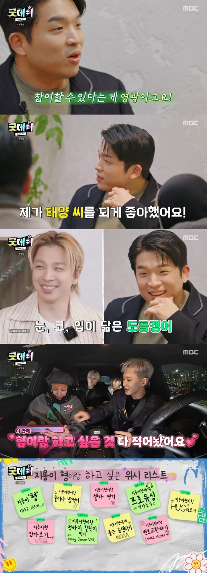 ‘굿데이’.사진ㅣMBC‘굿데이’에빅뱅완전체가등장했다.9일오후방송된MBC예능프로그램‘굿데이(GoodDay)(연출김태호,제작TEO)’에\\서지드래곤은곡의방향을찾아다양한아티스트를만났다.이날방송에서는지난주에이어홍진경집에방문한지드래곤이모습을보였다.홍진경은“기안이랑나랑진짜성덕이다”라며감격했고조세호는“저도처음에는엄청나게떨렸어요”라고말했다.지디는“태양이랑신인대처음으로숍에갔어요.계산대에남성분이쇼핑백한4~5개를들고서있는거예요.저사람이누굴까궁금했는데양배추였어요”라며조세호와의첫만남을회상했다.조세호는“그브랜드가진짜인기있어서같이갔던형짐을들어준거야”라며해명했고홍진경은“왜쟤만말을왜이렇게많이해.이러다가녹화시간다끝나!”라며화를냈다.이에조세호는“누나는지디랑하고싶은게뭐예요?”라며다른멤버들과자리를피해줬다.홍진경과지드래곤만남은상황에서홍진경은무리한소개팅상황극을잡아좌중을폭소케했다.이후홍진경은지드래곤과꿈에그리던듀엣무대를하게됐다.지디는“밥도너무맛있게먹고준비를과분하게받았는데누님이할부분이있으면요청을드리는거죠!각자의재능들이다있잖아요”라고다소모호한말을했다.이를듣던기안84가웃자홍진경은“쓰겠다는거야말겠다는거야?”라며고개를갸웃거렸다.조세호는“누나가오늘만난것도좋다고했잖아요”라고했고홍진경은“그러니까쓰겠다는거야말겠다는거야?”라며역정을냈다.그는“아니먹물리소토하는데8만원넘게썼어.노래방대여료도15만원썼어”라고토로했고조세호는“그럼우리가10만원씩모아서드리자”라며상황을무마해웃음을자아냈다.다른날지디는정형돈과데프콘을만났다.지드래곤은“지금까지본모습중에가장연예인같아요”라며정형돈을향한애틋한마음을전했고정형돈도“나이제이런거안받아줘”라고하면서도미소를지었다.형돈은“곡작업을하는거야?파트싸움나면어떡하려고?지금네가생각하는멤버가몇명인데?”라며관심을가졌다.지디가“한열분정도돼요”라고하자형돈은“난너희밖에안봤는데?”라며당황했다.데프콘이“나지금지디네번째보는데?수현이,시완이,해인이도봤어”라고하자정형돈은“지금성떼는거...?난어그로야?”라며어이없어했다.데프콘은“이식당이오늘만날분이추천해준식당이야.난진짜영광이야.원래예능안하시는데”라며곧만나게될출연자를소개했고이때안성재셰프가등장했다.안성재는“어렸을때분노의질주를보면레이싱을하잖아요.레이싱크루를했어요.그때부터자동차정비공꿈을꿨어요.정비학교에가려고했는데요리학교를우연히지나쳤어요.궁금해서한번해봐야지했는데재밌더라고요”라며요리를시작하게된이유를밝혔다.그는“다른길을모른것도있고지금까지온게아까워서그런것도있는데지금생각해보면꾸준했던것같아요.30살에총괄셰프가되고34살에레스토랑열고35살에별을받았어요”라고덧붙였다.이어“최고가누구냐고했는데그최고를찾아갔어요.모든것을배우다보니빠르게성장할수있었어요”라고말해멤버들을놀라게했다.지디는“저도11년연습생생활했어요.SM에서5년,YG에서6년했어요.학교갔다가오면옷갈아입고청소하고배웠어요.선배님들연습에방해될까봐사각지대에있었어요.연습은하지만어떻게될지몰라”라며안성재의말에공감했다.식사도중데프콘은“셰프님,방문했던식당음식중생각보다실망했던요리도있었어요?”라고물었다.이에안성재는“‘흑백요리사’전에는아무말없이나갔어요.그냥돈아깝다생각보다별로네하고갔어요.그런데방송후에는사업에영향을끼칠수있으니까맛을평가하는것보다그분을응원하는게더중요하다고생각해서더신경써서응원하게되더라고요”라고솔직하게말했다.또“‘여기서뭘추가하면될까요?’라고묻는사람이있으면어떡하냐”는정형돈의질문에지디는“저는그렇게물어보는것도열정이라고생각해서저는대답해줘요.저같으면이렇게했을것같아요이렇게는해요.답은아니지만답은하는거예요”라고말했고안성재역시공감했다.마지막으로데프콘은“예능섭외가많았을텐데왜거절했냐”고물었다.이에안성재는“‘나는요리사다.음식으로감동과맛,좋은시간을드리는사람’이라고생각했어요.사실‘굿데이’가첫예능인데좋은영향을줄수있다는프로젝트니까여기에참여하는것부터가영광이라고생각해요”라고답했다.이어“셰프로서저만의영역이있고보여줄수있는삶이있는데선한영향력이됐으면하는마음에서참여했다”고덧붙였다.다른날GD는부석순을만났다.지드래곤을본부석순은설렘을감추지못했고“저희가형이랑하고싶은것들을적어봤다”라며위시리스트를적은앨범을전했다.부석순은“형동생이되려고요”라며계속해서어필했고GD노래를재생하며팬심을보였다.이어세사람은패스트푸드점에방문,햄버거를주문했다.호시는“형은가사쓸때어떻게하세요?”라며궁금한점을물었고지디는“난작사를할때나안할때나그냥계속써.그냥간판보거나메뉴보거나”라며진심으로조언했다.네사람은네컷사진을찍은후오락실에방문했다.호시는“진짜편하게전화해도돼요형?”이라며진심으로물었고부석