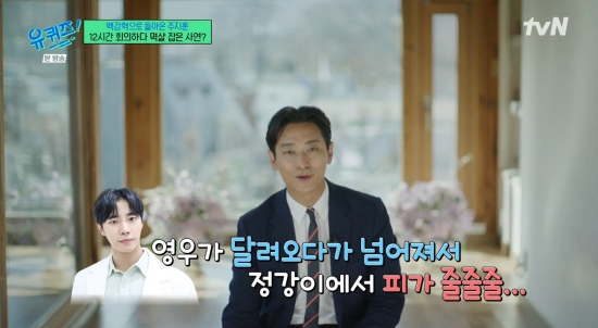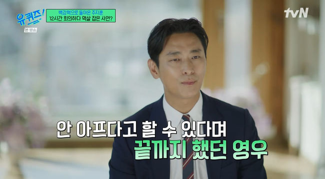 방송화면캡쳐[OSEN=김예솔기자]배우주지훈이추영우를칭찬했다.12일방송된tvN'유퀴즈온더블럭'에서는넷플릭스'중증외상센터'의배우주지훈이후배인추영우에대해칭찬했다.주지훈은'유퀴즈'에출연하기전에우연히조세호를만났고동갑이라친구가됐다고말해웃음을자아냈다.유재석은"주지훈씨가5년전에나왔는데그때39살,지금은44살이됐다"라고말했다.방송화면캡쳐주지훈은'중증외상센터'를처음봤을때느낌을이야기했다.주지훈은"내가웹툰이나웹소설원작인작품을많이했다.만화나소설은글로독자를설득한다.그래서설명이많다.이걸영상으로옮기면동어반복이된다.그런걸줄여나가는과정을감독님과많이했다"라고말했다.주지훈은"영화,드라마중간에시리즈라고부른다.영화감독과영화스탭이있고대본은드라마다.그걸섞는장면이필요한것같다"라고말했다.방송화면캡쳐주지훈은"이건극이지않나.수술을정교하기에대단한건게스펙타클이없지않나.이런걸보여줘야하니까극적허용으로피가튀면실제의사선생님들은이정도면사망한다고한다.정답이없으니까거의멱살잡기직전까지회의를하고열정적으로의견을내놨다"라고말했다.주지훈은"'중증외상센터'팀은배우들이나보다훨씬후배인데정말고맙다.다같이스터디를했다.나랑감독님이친하니까일부러우리끼리보여줬다.대학교스터디하듯이해보자고했다.짧게는7시간,길게는12시간씩했다"라고말했다.방송화면캡쳐주지훈은"외식나가는씬있지않나.영우가달려오다가넘어져서정강이에서피를줄줄흘렸는데그걸다치료받고찍었다.영우가상반신어딘가에염증이있어서수술을했다.레펠을하고촬영하는데아팠을거다.근데안아프다고할수있다고끝까지하더라"라고칭찬했다./[email protected][사진:tvN'유퀴즈온더블럭'방송캡쳐]Copyright©OSEN.무단전재및재배포금지.