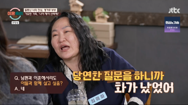 [OSEN=박근희기자]'이혼숙려캠프’캥거루아내가아들을향한과한애정을보였다.20일전파를탄JTBC예능프로그램'이혼숙려캠프'에서는술을끊지못하는남편과아들을과보호하는아내의갈등으로캠프에입소한'캥거루부부'가부부의모습이그려졌다.상담후아들이집을나가기로했냐는서장훈의질문에캥거루아내는“독립이요.집은제가해줘야지”라고말하며웃음을참지못했다.생활비에대해서는아들의여자친구가벌기로했다고덧붙였다.술을몰래먹은사건에대해캥거루남편은“좀갈등은있었다”라며변명을했고,이를들은서장훈은“우리앞에서안먹는다고했잖아요”라며언성을높였다.이후부부들의심리생리검사가이어졌고,캥거루남편이받은질문은‘당신은아들을가족이라고생각합니까’였다.남편은“네”라고답을했고,결과는진실이었다.이어‘조카와아내가물에빠지면조카를먼저구할겁니까’라는질문이이어졌다.캥거루남편은“아니오”라고답을했고,결과는거짓이었다.캥거루아내는‘남편과이혼해서라도아들과함께살고싶냐’는질문에“네”락답했고,이는진실이었다./[email protected][사진]‘이혼숙려캠프'방송화면캡쳐Copyright©OSEN.무단전재및재배포금지.