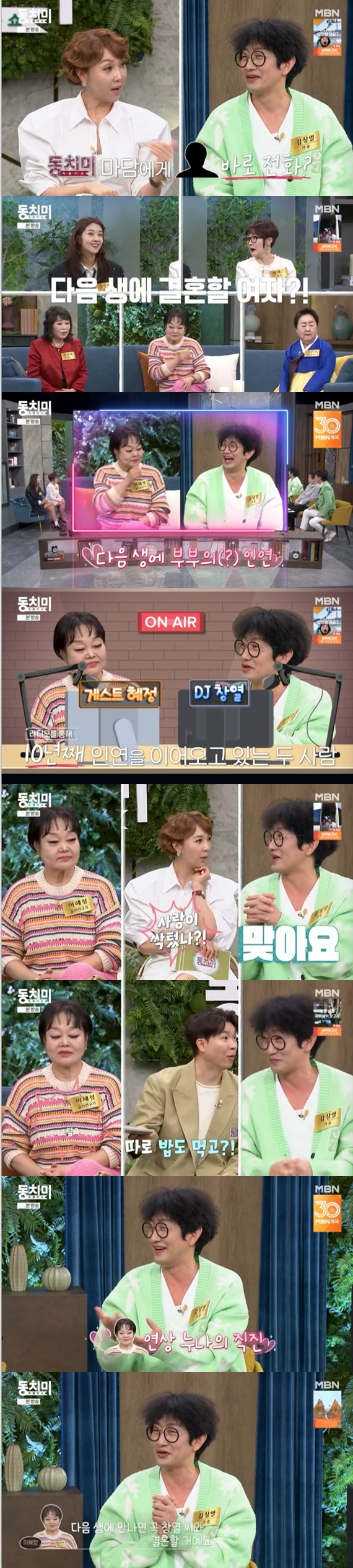 [스타뉴스|허지형기자]/사진=MBN'동치미'캡처가수김창열이요리연구가이혜정과결혼약속했다고밝혀깜짝놀라게했다.22일방송된MBN'속풀이쇼동치미'에는김창열이게스트로출연했다.이날MC최은경은"섭외받자마자우리마담님중에한분에게전화하고각별함을자랑했다고하더라"라고말을꺼냈다.이에김창열은"다음생에결혼할여자가(여기)있다.이혜정선생님"이라는폭탄발언으로스튜디오를발칵뒤집혔다./사진=MBN'동치미'캡처이혜정은"나이가있냐"고했다.김창열은"선생님이랑10년정도라디오게스트로같이했었다.저를너무아껴주셔서저희만의사랑이약간싹텄다.따로밥도먹고"라고말했다.이어"자연스럽게선생님이먼저'다음생에만나면꼭창열씨랑결혼할거다'라고말했다"고덧붙였다.이혜정은"방해하지말아라"라고강조했다.김창열은"박사님이랑도같이밥먹는데'다음생에창열씨랑결혼하겠다'고하니까'제발'이라고하셨다"고말해웃음을자아냈다.MC박수홍은"남편이허락한사랑이다"라고했다.허지형기자[email protected]©스타뉴스&starnewskorea.com,무단전재및재배포금지