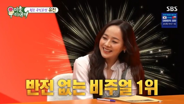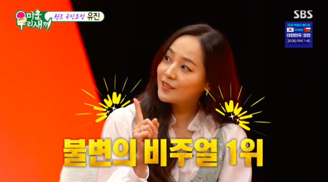 [OSEN=박하영기자]‘미운우리새끼’유진이미모에대한자부심을드러냈다.16일방송된SBS예능‘미운우리새끼’(이하‘미우새’)에서는원조국민요정유진이게스트로출연했다.이날서장훈은“역대걸그룹센터멤버중에최고비주얼을뽑는설문조사에서4위가핑클의성유리,3위미쓰에이의수지,2위소녀시대윤아,1위가S.E.S유진이라고한다.어떠냐”라고물었다.유진은“되게쑥스럽다.데뷔이래에이런조사는늘있었던것같다.중요한건단한번도1위를놓친적이없었다.제기억에서는그렇다”라고말했다.신동엽은“유진이가저랑도프로그램같이했었는데쉬는시간에항상매니저한테‘오늘조사나온거없어요?오늘조사안해요?’물어보더라”라고몰아갔다.이에유진은“조사계속해주세요”라고너스레를떨었다./mint1023/@osen.co.kr[사진]‘미운우리새끼’방송화면캡처Copyright©OSEN.무단전재및재배포금지.