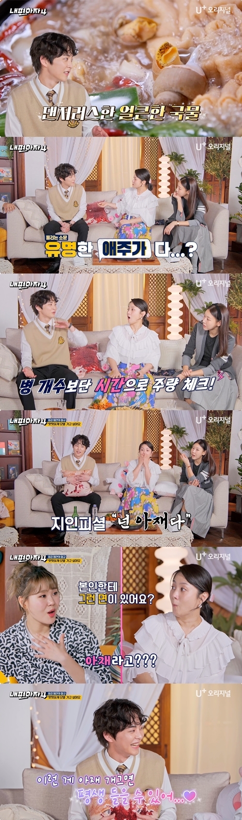 ‘내편하자4’.사진|U+시우민의주량제한없는매력에‘내편하자4’MC들이만취했다.11일자정공개되는U+오리지널예능‘내편하자4’에서는스페셜게스트로출연한시우민이가져온맛깔나는최애음식토크와함께주량,나이,그리고‘아재개그’까지한순간도눈을뗄수없는레전드회차가펼쳐진다.스페셜게스트로출연한시우민은“’내편하자’는내밥친구!”라며프로그램에대한애정을듬뿍드러냈다.이어시우민이직접선택한최애‘골뱅이탕’한상차림이공개되자,애주가MC들은환호성을질렀다.시우민은“골뱅이탕은굉장히위험한(?)안주”라며“3차안주인데술이더들어가게만든다”고설명했다.이에박나래가“시우민씨가애주가시라는소문을들었다”라고운을떼자,시우민은“네”라며쿨하게인정했다.한혜진이“얼마나드세요?”라고묻자,시우민은“전사실병보다는시간이다”라면서남다른주량체크기준과함께필름이안끊기는기본주량과좀비모드로버티는최대주량을거침없이밝혔다.이에박나래는“주량까지완벽하게타고났다”라며감탄했다고해궁금증을자극한다.한편,연예계최강동안시우민은“나이가들었다는생각이든적있나요?”라는질문에“아재개그로지인들에게‘아재’라고들은적있다”라는뜻밖의답을해MC들을의아하게만들었다고.이에박나래를비롯한MC들이“시우민이하는아재개그가상상이안된다”라며궁금해하자,시우민은곧바로‘아재개그’를선보였다고해술,안주,깨알애드립까지다되는시우민표매력에취한‘내편하자4’본방송에관심이모아진다.‘만능돌’시우민과함께하는‘내편하자4’8회는11일자정U+tv와U+모바일tv를통해공개된다.[김소연스타투데이기자]Copyright©스타투데이.무단전재,재배포및AI학습이용금지