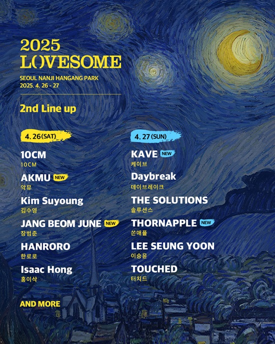 (엑스포츠뉴스명희숙기자)'2025러브썸페스티벌'이화려한라인업을자랑했다.10일'2025러브썸페스티벌(2025LOVESOME,이하2025러브썸’)측은AKMU(악뮤),장범준등4팀이포함된2차라인업을공개했다.지난2월,10CM,홍이삭,이승윤,데이브레이크,터치드,한로로,솔루션스,김수영등대중성과다양성을모두잡은1차라인업으로화제를모았던2025러브썸은이번엔봄캐럴의대명사로불리는아티스트가모두포함된2차라인업을공개하며다시한번관객들을열광시켰다.4월26일,토요일라인업에는봄캐럴의창시자이자모두가인정하는봄대표아티스트‘장범준’과‘200%’,‘후라이의꿈’,오랜날오랜밤’등경쾌한창의력으로전세대에게꾸준하게음악적즐거움을주고있는‘AKMU(악뮤)’가추가되었다.이번장범준의출연은2021년,비대면으로진행되었던‘하이크페스티벌’이후4년만에성사된페스티벌무대로,오랜만에관객과가까운거리에서함께호흡하며봄을맞이하고자한다.개최이튿날인4월27일엔사이키델릭한사운드와감성적인가사로탄탄한고정팬층을확보한쏜애플과한국뿐아니라,동남아등다양한국가에서꾸준하게사랑받고있는케이브(KAVE)가2차라인업으로이름을올렸다.쏜애플과케이브가추가된일요일라인업은현재까지전원밴드로구성된상태로,과연최종라인업까지전원밴드로구성될지에대한팬들의기대감이고조되고있다.이에대해주최측인인넥스트트렌드는"올해에는양일라인업의분위기를사뭇다르게기획함으로써관객들에게다채로운음악적즐거움을선사하고자한다"며"토요일에는장범준과AKMU(악뮤)등봄과어울리는싱어송라이터를중심으로,일요일에는생생한현장사운드를선사할수있는밴드를중점에두고라인업섭외를진행했다"는후일담을전하기도했다.한편‘러브썸페스티벌’은매년올해의도서를선정,책과함께하는음악피크닉이라는이색적인콘셉트로,2019년부터매년봄관객들을찾아가고있으며,올해는한국인들이가장사랑하는화가‘반고흐’의삶을담은‘반고흐,영혼의편지’가올해의도서로선정되었다.‘2025러브썸페스티벌’의공식티켓은‘예스24(YES24)’와‘인터파크’,‘네이버예약’을통하여구매할수있으며,주요일정을비롯한다양한정보는공식SNS를통해확인할수있다.사진=인넥스트트렌드명희숙기자[email protected]©엑스포츠뉴스.무단전재및재배포금지.