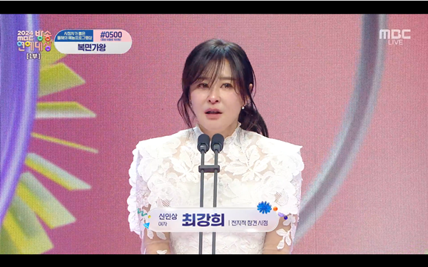 사진=2025MBC방송연예대상[스포츠한국신영선기자]최강희가눈물의신인상을수상하며감동을전했다.지난28일열린'2025MBC방송연예대상'에서배우최강희가데뷔29년만에예능신인상을수상하며감격의눈물을흘렸다.이날시상식은방송인전현무,이장우,윤은혜가진행을맡았다.최강희는MBC'전지적참견시점'에서의활약으로예능여자신인상을수상하며무대에올랐다.흰색드레스를입고트로피를받은그는"사실이자리가얼마나귀한자리인지는아는데지금아무생각도나지않는다"고울먹이며말문을열었다.사진=2025MBC방송연예대상그는"믿기지가않는다.제가한건없다.이상은제작진분들이받아야하는게아닌가싶다"며제작진과함께출연을도와준이들에게감사인사를전했다.특히활동을쉬는동안생계를위해설거지아르바이트와가사도우미를했던경험을솔직히털어놓으며,그기간동안자신을응원해준주변사람들에게감사를표했다.최강희는고깃집사장님과친구,그리고김숙,송은이,양치승관장에게도감사인사를전했다.이모습을지켜보던송은이역시눈시울을붉히며감동을더했다.최강희는어려운시간을보내고있을이들에게따뜻한위로와용기의메시지도잊지않았다.그는"어떤일을열심히하다가주저앉아울고고민하는분들이얻을수있는기회가그자리에서는것뿐일지라도,그것이얼마나대단한일인지알고포기하지않았으면좋겠다"고말했다.최강희의진솔한수상소감과눈물은많은이들에게용기와희망을전하는메시지로감동을전했다.스포츠한국신영선기자[email protected]©스포츠한국.무단전재및재배포금지.
