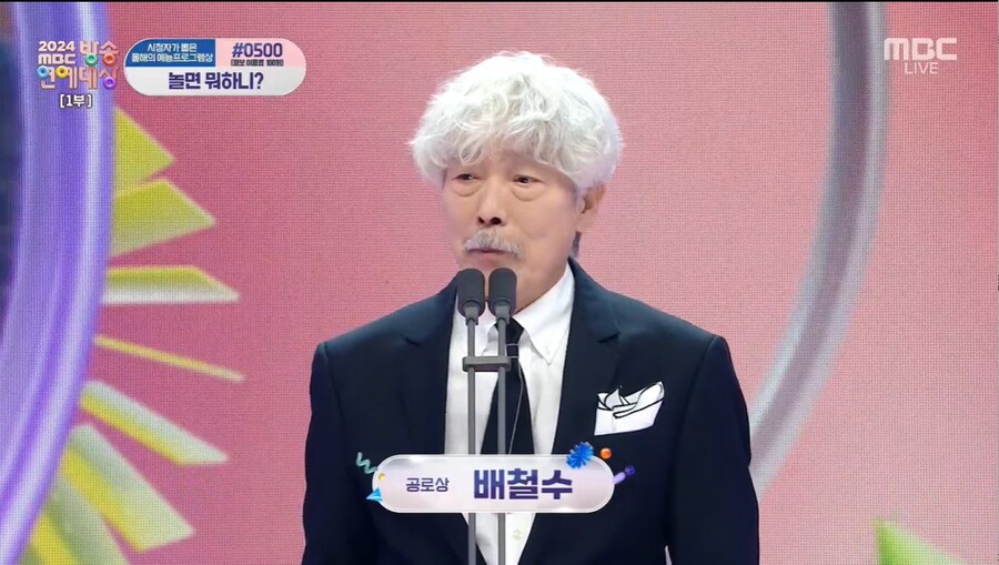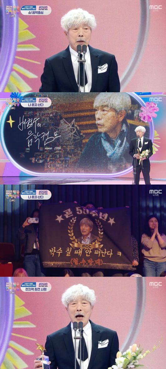 ▲배철수.출처|2024MBC방송연예대상방송화면캡처[스포티비뉴스=김현록기자]배철수가MBC방송연예대상공로상을품에안았다.'배철수의음악캠프'25년을맞은DJ배철수는28일서울상암동MBC에서생방송으로개최된'2024MBC방송연예대상'에서공로상을수상했다.1990년부터MBC라디오'배철수의음악캠프'를진행하며청취자와음악으로소통중인배철수는대한민국라디오의살아있는역사다.그는"MBC에서공로상을주신다고해서제가공을세운게있나돌이켜봤다.인연은많더라"며"1978년에MBC대학가요제로데뷔했다.평범한대학생이었다가엉겁결에데뷔한것이다.1979년송골매를만들어서1980년인가'영일레븐'이란프로그램에서인기를조금씩얻기시작해1982년부터4년연속MBC10대가수상을받았다.대한민국음악계에서록밴드로는전무후무하다.1990년부터는'배철수의음악캠프'라는팝전문프로그램을35년째진행하고했다"고말했다.배철수는"MBC와일을오래했다.MBC가저를살게해준거니까제가MBC에게상을줘야할것같다.심지어MBC직원과결혼까지했으니까"라고너스레를떨었다.배철수는이어"공로상이런것받으면'할만치했으니적당히마무리하고들어가라'이런이야기아니겠습니까.제가늘농담처럼이야기합니다만아직막내아들이대학생이라조금만더하도록하겠다"면서"농담처럼이야기했지만공로상을받았으니저에게남아있는방송연예인생이얼마없구나하는걸확실히자각한다.그것이언제인지모르겠지만,그때까지늘재미있게달려보도록하겠다"고강조했다.끝으로그는"여러분새해복많이받으시고,올한해는웃을일이많은한해가됐으면좋겠다"고덧붙였다.2024MBC방송연예대상'은1995년처음시작된이래올해로30주년을맞았다.당초지난해12월29일개최예정이었으나제주항공여객기참사로취소돼이날시상식이생방송으로열렸다.전현무,이장우,윤은혜가MC를맡았다.▲배철수.출처|2024MBC방송연예대상방송화면캡처<저작권자ⓒSPOTVNEWS.무단전재및재배포금지>Copyright©스포티비뉴스.무단전재및재배포금지.