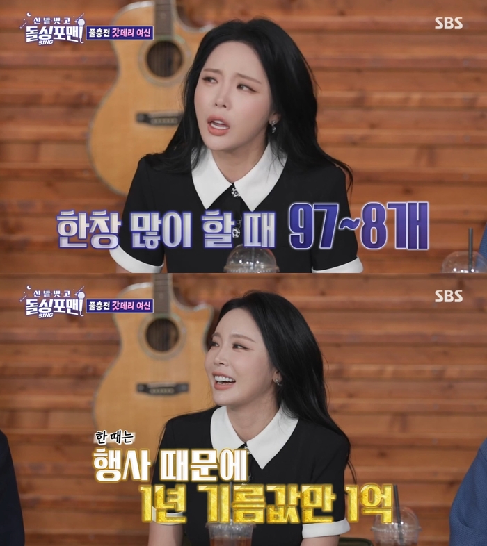 ‘신발벗고돌싱포맨’.사진ISBS‘신발벗고돌싱포맨’방송캡처가수홍진영이행사여신의위엄을뽐냈다.28일방송된SBS‘신발벗고돌싱포맨’에는진성,홍진영,요요미,박지현이게스트로출연했다.이날이상민은홍진영에대해“일명‘갓데리여신’아니냐.노래하기열악한상황에서도홍진영의배터리는완충이라더라”라고말했다.이어폭우가쏟아지거나정전이돼도노래하는홍진영의모습이담긴영상이공개돼감탄을자아냈다.임원희는홍진영에게“한달에제일많이했을때행사몇개나했냐”고물었다.홍진영은“한창많이했을때는98개정도했다”고답했다.이에이상민은“(홍진영이)진짜행사를많이했을때는1년기름값만1억이라더라”라고해눈길을끌었다.한편‘신발벗고돌싱포맨’은매주화요일오후9시방송된다.[이세빈스타투데이객원기자]Copyright©스타투데이.무단전재,재배포및AI학습이용금지