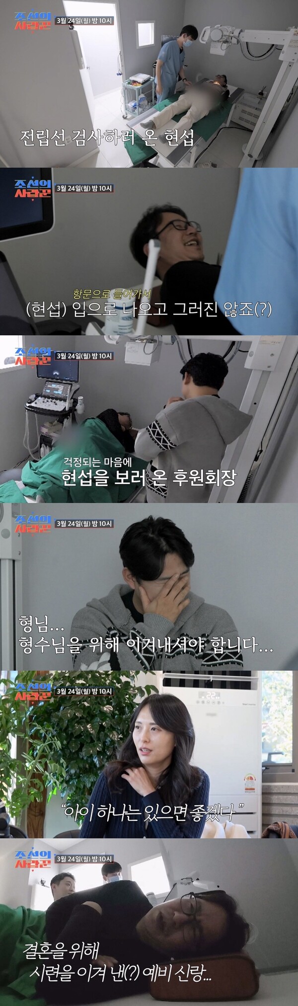 ▲24일오후10시방송되는'조선의사랑꾼'장면들.제공|TV조선[스포티비뉴스=김원겸기자]TV조선다큐예능‘조선의사랑꾼’54세예비신랑심현섭이'결추위'후원회장이자'다둥이아빠'이천수와함께비뇨기과로향해충격과공포의상황속에빠진다.24일방송될‘조선의사랑꾼’에서는심현섭이결혼전필수코스인남성웨딩검진을위해비뇨기과침대위에누워있는모습이포착된다.전립선검사를위해항문에삽입해야만하는막대형탐촉자를처음본심현섭은공포에질려"마취안하나요?","(항문으로들어가서)입으로나오고그러진않죠?"라고말해웃음을자아낸다.이를지켜보던사랑꾼MC들도"저검사를마취안하고어떻게하냐","진짜아플것같다"며경악한다.하얗게질려있는심현섭을위해'결추위'후원회장이천수는"(결혼전해야하는)중요한검사"라며용기를북돋운다.하지만심현섭은"결혼해도이런검사안해본사람도많다더라"며마지막까지두려움에떤다.이에'전립선검사유경험자'이천수는"남자가건강하면여자도건강해진다.(형수님에대한)배려아니냐"며심현섭을단호하게설득한다.전립선검사가시작되고나서도후원회장이천수가심현섭곁에열성적으로붙어있자,이를보던김국진은당황하며"천수는왜저기있는거냐"고말해웃음을자아낸다.2세를바라는여자친구영림을위한'예비신랑'심현섭의눈물겨운결혼준비기는24일오후10시방송되는TV조선다큐예능‘조선의사랑꾼’에서공개된다.<저작권자ⓒSPOTVNEWS.무단전재및재배포금지>Copyright©스포티비뉴스.무단전재및재배포금지.