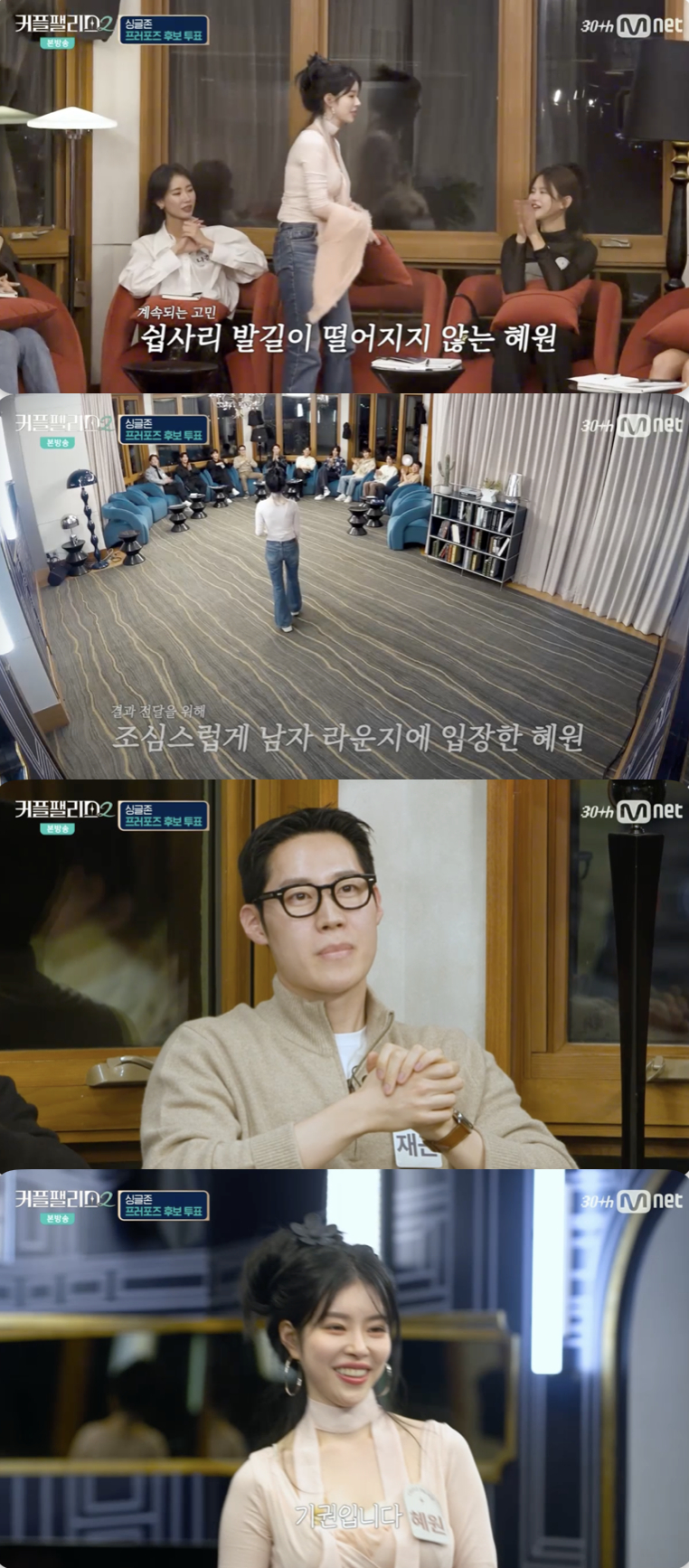 [스타뉴스|정은채기자]/사진='커플팰리스2'방송화면캡쳐'커플팰리스2'에서유혜원이기권을선언했다.26일방송된Mnet'커플팰리스2'8화에서는싱글존팰리스위크둘째날저녁모습이그려졌다.이날뷰티모델여자19번,유혜원은싱글존최종프러포즈후보투표에서망설임끝에어렵게남자출연진들이있는곳으로걸음을내딛었다.이어진인터뷰에서유혜원은최종프러포즈후보투표직전일본대기업회사원남자3번,황재근과의대화에서황재근이자신과VIP전담은행원서진주사이에서고민중이란이야기를듣게됐다고털어놨다.그는"남자라는사람이(저한테)'얘를선택할까,쟤를선택할까'하는경험을처음해본다.그래서너무당황스럽다"라고속마음을고백했다.이어그는투표지를건네지않고"기권입니다"라며선택을포기하며팰리스퇴소를선택했다.그는"3번(황재근)님이저를픽할줄알았는데안픽하셔서.근데그렇다고제가(서)진주님한테서(황재근님을)뺏을수없지않냐.제가막유혹을해서'넌나한테오게되어있어'(라면서)그사이를뚫고억지로막하고싶지않았다.저는10번을저를찌르면(그제서야)끌려가버리는스타일이다"라고기권의이유를솔직하게털어놨다.정은채기자[email protected]©스타뉴스&starnewskorea.com,무단전재및재배포금지